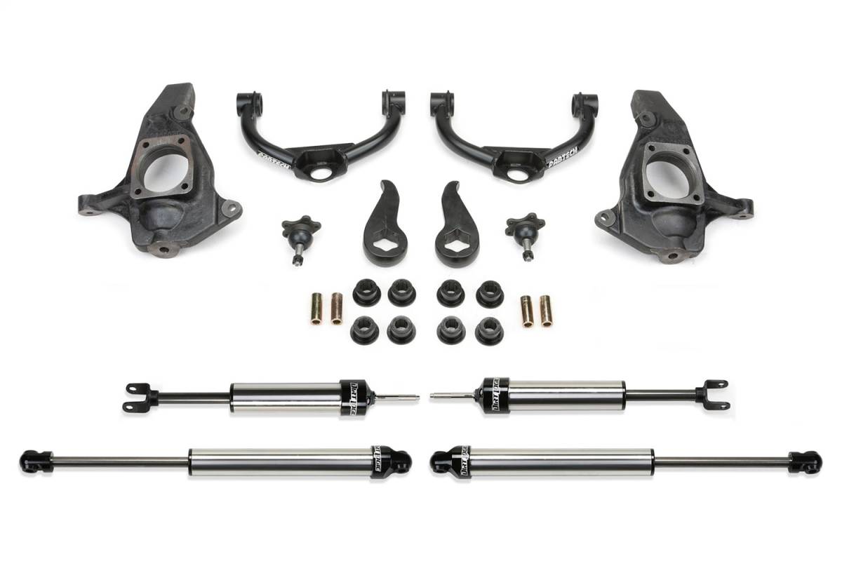 Our 4 Ultimate System provides less lift than our 6 RTS(TM) system but still allows use of 33 or 35 tall tires with cutting for street and offroad use. We have developed this system utilizing replacement upper control arms constructed of 1.50 OD .120 thick wall DOM tubing that attaches to heavy duty Fabtech ductile iron steering knuckles. The factory torsion bars remain in the stock position and use new forged adjusting keys to provide the proper amount of lift. There is no loss of ground clearance with this system as the stock lower control arms, torsion bars and front differential do not need to be relocated. This 4 Ultimate System will level the stance of the vehicle compared to the factory nose down rake with no change to the rear suspension. For those customers that require a factory nose down appearance an optional 1 rear block kit is available (2500HD Part # FTS21110) (3500HD Part # FTS21111).