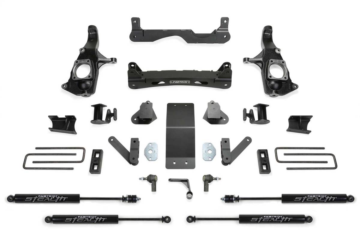 Fabtechs new 4 crossmember systems utilize their proven heavy duty construction and design features for a robust suspension upgrade. The 4 system features high arched lower control arm crossmembers constructed of 1/4 thick steel for maximum strength. The Fabtech ductile iron steering knuckles retain the near stock track width keeping tires under the fender for a clean appearance. Rear lift is accomplished with a block and u bolt configuration.