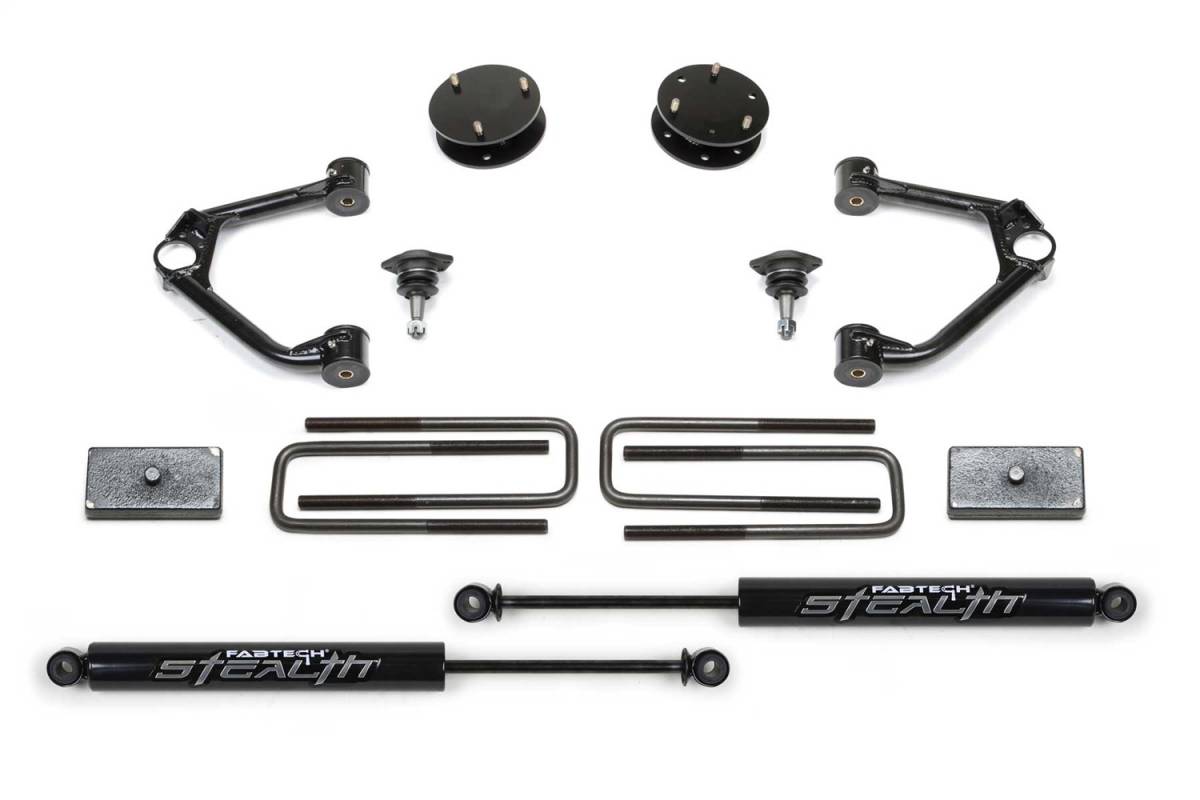 This quality Upper Control Arm system provides a 3.5" increased ride height over stock without creating suspension bind at full droop. Lift is accomplished with spacers that utilizes the factory coilover shocks for a stock ride. The Fabtech Upper Control Arms address the geometry of the front suspension with the new ride height for proper align-ability. Heavy duty ball joints allow for extended travel to eliminate binding. Due to the GM suspension geometry there are no differential drop brackets required for the CV axles to operate properly. Rear lift comes from 1 blocks and u-bolts.