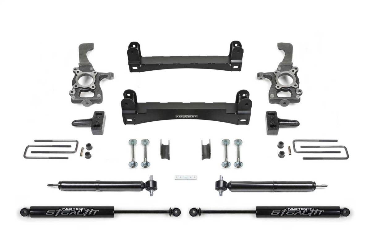 These heavy duty systems feature 1/4 thick steel lower control arm crossmembers with adjustable alignment cams for ease of installation while strengthening the front suspension. Extended length ductile iron steering knuckles allow use of 18 or 20 wheels. The Basic System includes front spacers utilizing the factory Coilover shock while the rear receives Fabtech Performance twin tube shocks.