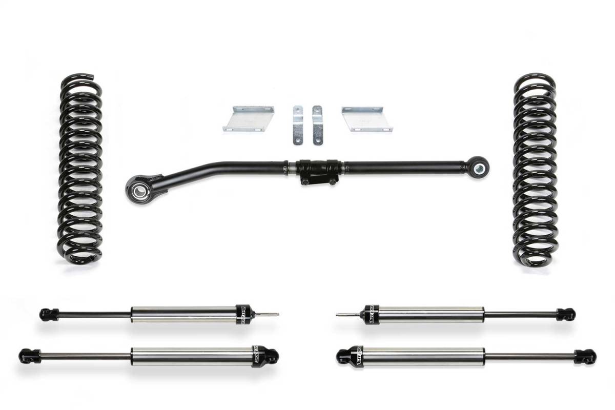 This Super Duty lift kit is perfect for the enthusiast looking to run oversized tires and wants additional wheel travel for offroad use. With the large Super Duty wheelwell openings and this quality 2.5" lift kit, you can run 35" tall tires with ease. Fabtech's coil springs retain the factory load carrying capacity while providing increased suspension travel. The coil springs and associated bracketry allow for an additional inch of compression travel over stock without binding the suspension. This extra travel helps when offroading in rugged terrain. Sway bar drop brackets are included to reposition the front bar so that the link ends do not go over center at full droop and cause bind. The brake lines are relocated down on the frame with extension brackets to eliminate the possibility of overstretching the lines throughout the new travel range. Fabtech provides extension brackets rather than longer brake lines to keep the factory brake system sealed for fast and trouble-free installation. This suspension kit utilizes the factory bump stops without extensions. This allows for more travel with the Fabtech coil springs and components. To help keep the factory alignment specifications of the vehicle, Fabtech includes 2 degree adjustable alignment ball joint inserts. They help retain the factory caster specifications for optimum driveability. After a Super Duty is lifted the front axle is pushed to one side due to the length of the track bar. To address this issue Fabtech provides a heavy-duty adjustable track bar. The Fabtech track bar allows for on the vehicle adjustment to center the axle under the vehicle. This provides proper tracking of the front and rear axle for excellent highway manners. This Super Duty lift kit includes Fabtech Performance shocks. They are a twin tube shock that will provide a good highway ride with the ability to tackle offroad.