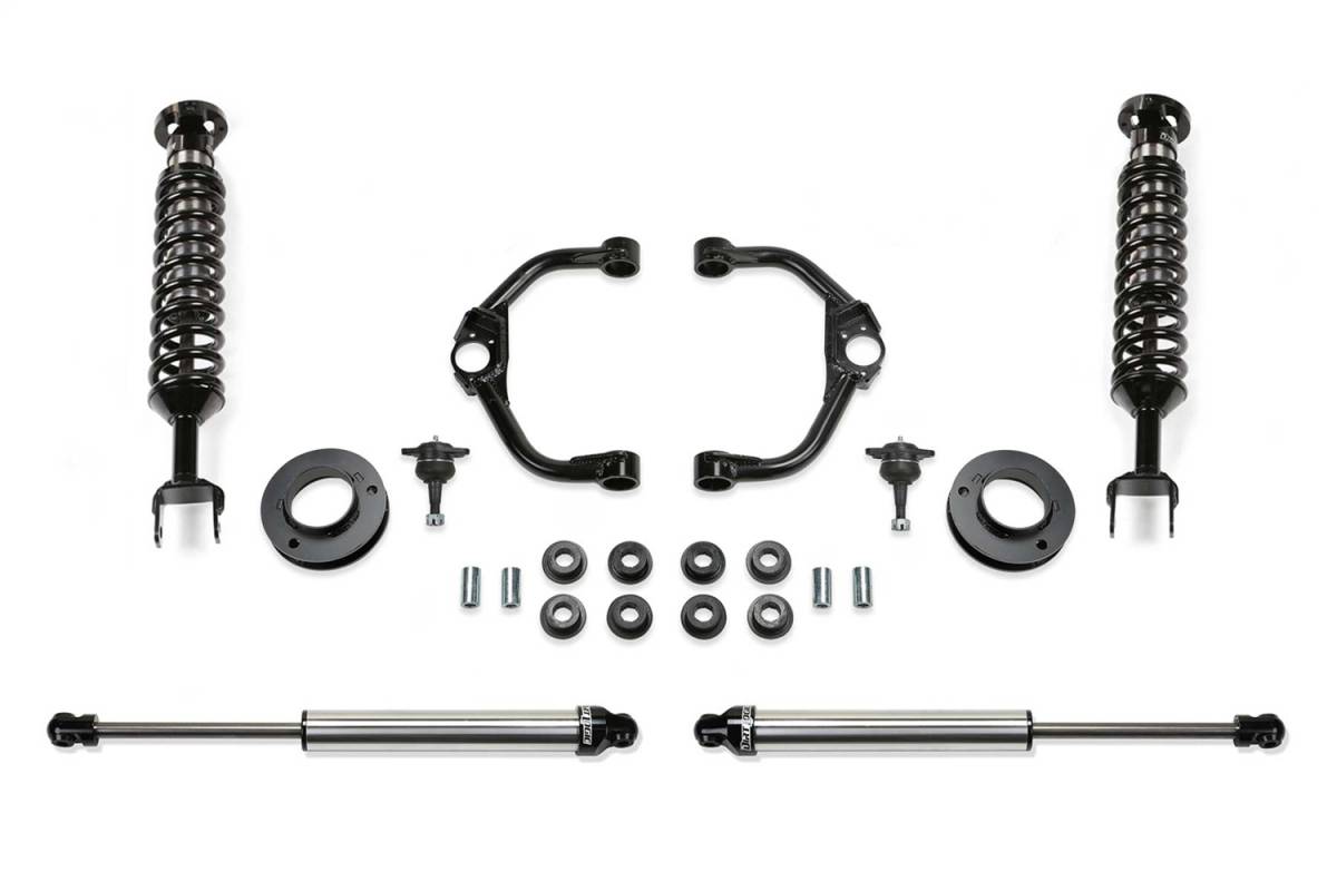 This new 4 System capitalizes on Toyota Tundras large wheelwell opening to allow use of 35 tall tires with minimum lift height. The design of this 4 System is a new style of suspension that delivers improved performance with fewer parts, and comes with an affordable price. The system includes replacement upper control with a .120 wall DOM arm with heavy duty extended range ball joints that provide additional strength to the front suspension. Heavy duty extended length steering knuckles are included to provide proper functionality of the factory ESC (Electronic Stability Control) with 35 tall tires. The knuckles retain the stock track width keeping the tires under the front fenders. The front differential is relocated to keep CV angles proper during the full range of travel. Front bump stop extensions and brake hose relocation brackets complete the front suspension. Rear lift comes from a 1 lift block and u-bolt system to level the stance of the vehicle. The 4 System is available with a spacer system to retain the factory Coilover shocks and rear Performance shocks.