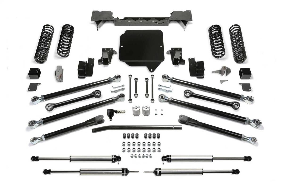 Fabtechs JL Crawler long arm systems are built to meet the most experienced drivers expectations without having a questionably fabricated suspension. If you are in the market for a system that will work properly right out of the box and does not require continued fabrication and constant maintenance, look no further. A key part of the mounting of the Crawlers 5 Ton Link Arms to the frame is the geometry and ground clearance. The location of the frame side of the link arms is critical in providing superior handling throughout the travel range. Fabtech has found the sweet spot geometry for the link arms that provide a superior driving long arm system compared to all others on the market. Front link arm are mounted to a full width crossmember that spans frame rail to frame rail. This crossmember is a key in not only in mounting the Links arms at the correct geometry but it adds critical strength to the lighter weight JL frame for hard offroad use. Rear links attach to new frame mounts on the side of the frame for increased ground clearance and approach angle. The Fabtech lower Link Arms are massive and built of 2" OD .313 thick wall tubing that is guaranteed not to bend. Upper and lower Link Arms includes the Fabtechs legendary 5 Ton joints that come with lifetime guarantee of never wearing out. They are superior for offroad use with a smooth quiet operation on the street.