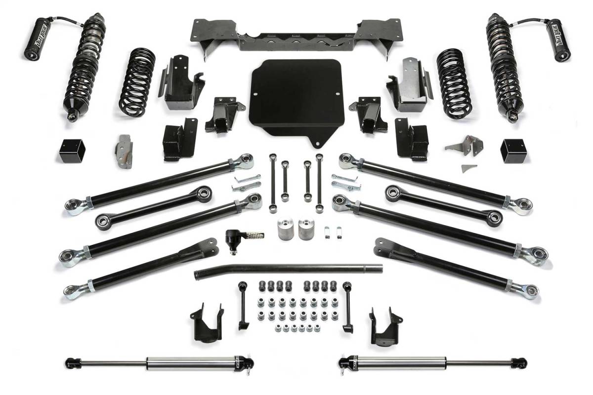 Fabtechs JL Crawler long arm systems are built to meet the most experienced drivers expectations without having a questionably fabricated suspension. If you are in the market for a system that will work properly right out of the box and does not require continued fabrication and constant maintenance, look no further. A key part of the mounting of the Crawlers 5 Ton Link Arms to the frame is the geometry and ground clearance. The location of the frame side of the link arms is critical in providing superior handling throughout the travel range. Fabtech has found the sweet spot geometry for the link arms that provide a superior driving long arm system compared to all others on the market. Front link arm are mounted to a full width crossmember that spans frame rail to frame rail. This crossmember is a key in not only in mounting the Links arms at the correct geometry but it adds critical strength to the lighter weight JL frame for hard offroad use. Rear links attach to new frame mounts on the side of the frame for increased ground clearance and approach angle. The Fabtech lower Link Arms are massive and built of 2" OD .313 thick wall tubing that is guaranteed not to bend. Upper and lower Link Arms includes the Fabtechs legendary 5 Ton joints that come with lifetime guarantee of never wearing out. They are superior for offroad use with a smooth quiet operation on the street.