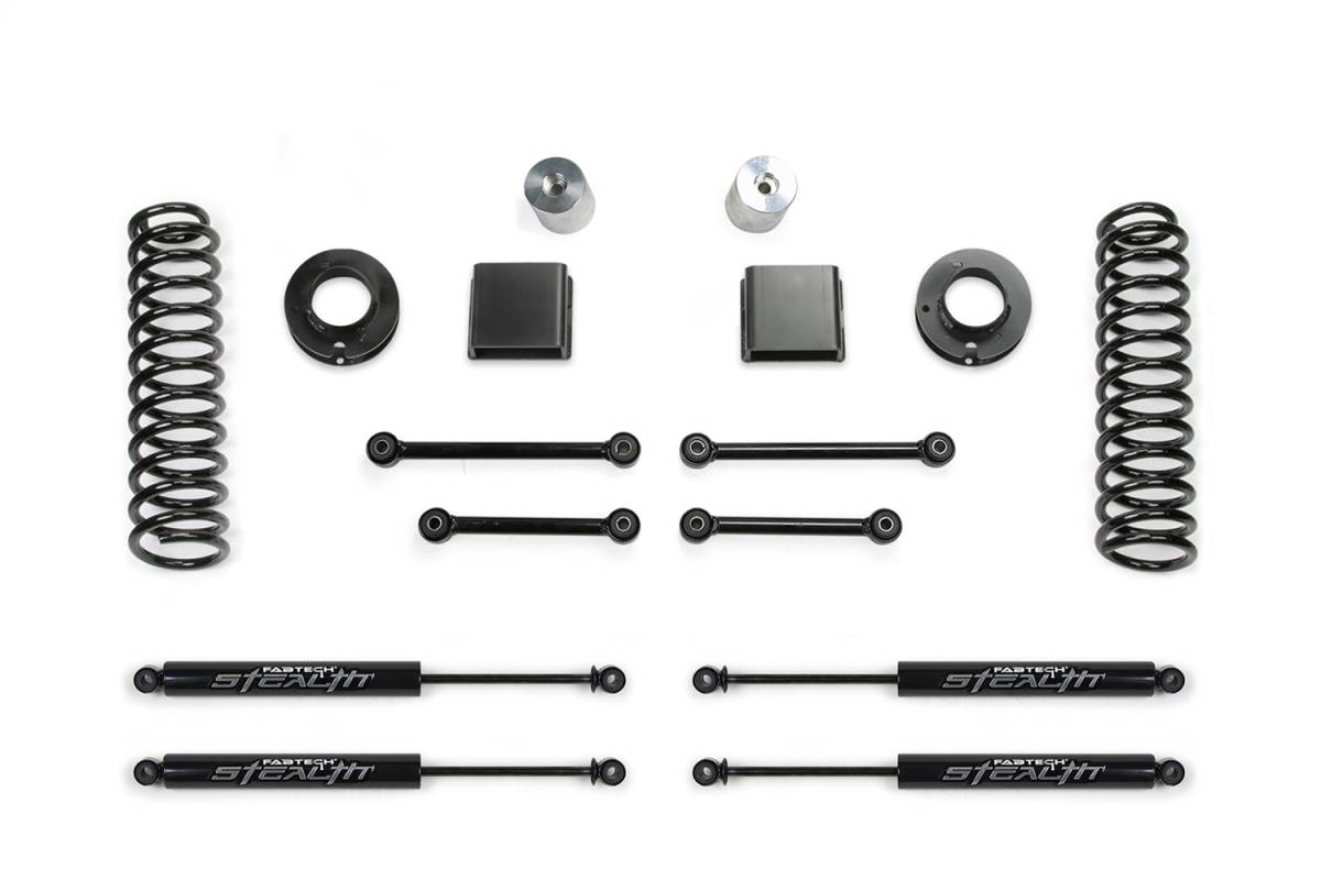 This Sport lift kit is Fabtech's most popular Jeep system providing increased ride height and suspension performance at a great price. Installation is easy and can be installed in a couple hours. The Sport lift kit features American made front coil springs that are a dual rate design allowing extended suspension travel for offroad use while providing a smooth highway ride. The first stage of the spring provides a soft ride with the ability to extend for additional travel. The second stage is designed to handle the payload of the vehicle and address large impact absorption at higher speeds. The rear of the vehicle receives coil spring spacers retaining the factory ride and load carrying capacity. The spacer height is 1-3/4" to help level the stance of the vehicle. Four bump stops extensions utilize the factory bump stops for compliant cushioning at full compression. The extensions retain the stock down travel to eliminate over cycling of the suspension and driveline.