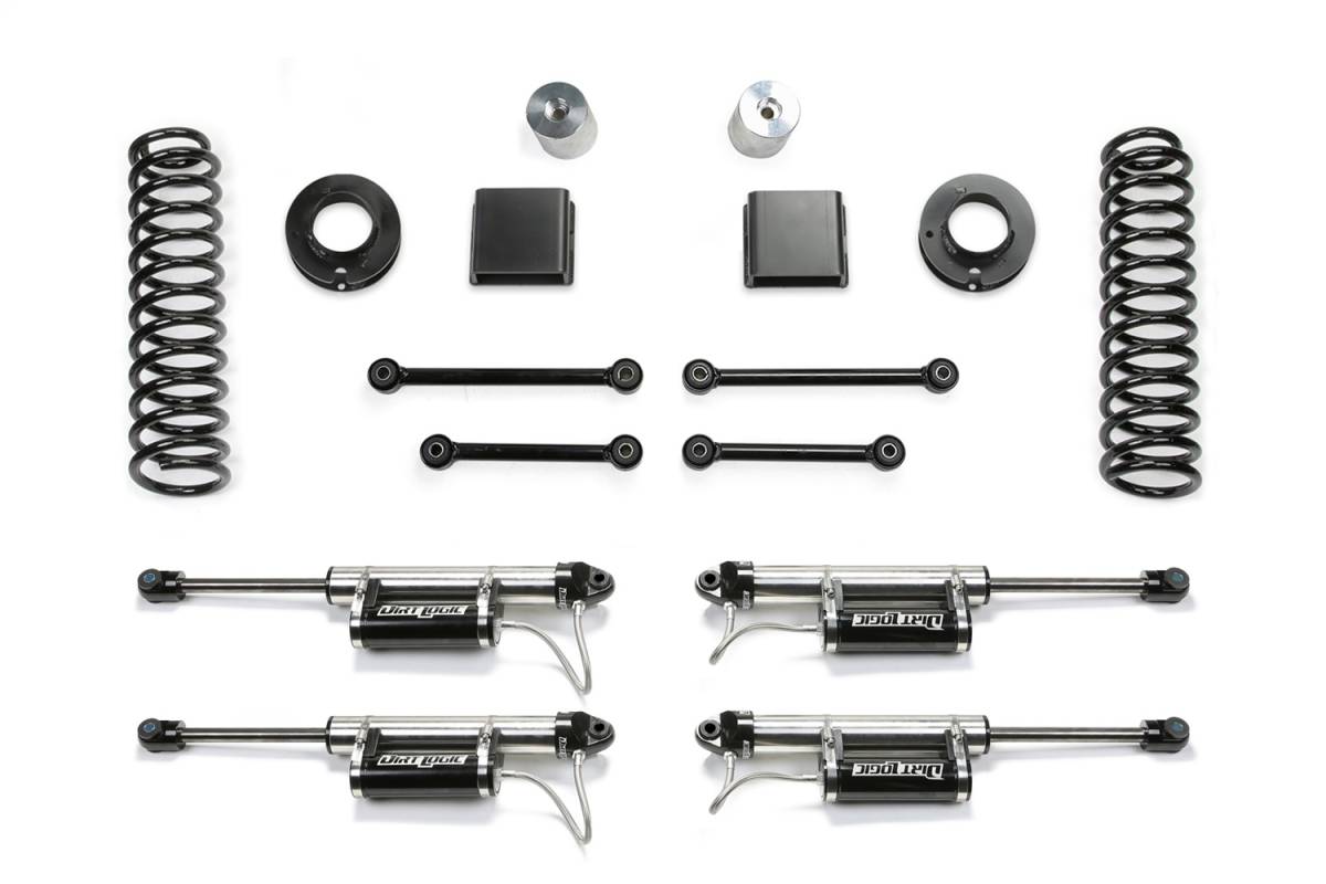 This Sport lift kit is Fabtech's most popular Jeep system providing increased ride height and suspension performance at a great price. Installation is easy and can be installed in a couple hours. The Sport lift kit features American made front coil springs that are a dual rate design allowing extended suspension travel for offroad use while providing a smooth highway ride. The first stage of the spring provides a soft ride with the ability to extend for additional travel. The second stage is designed to handle the payload of the vehicle and address large impact absorption at higher speeds. The rear of the vehicle receives coil spring spacers retaining the factory ride and load carrying capacity. The spacer height is 1-3/4" to help level the stance of the vehicle. Four bump stops extensions utilize the factory bump stops for compliant cushioning at full compression. The extensions retain the stock down travel to eliminate over cycling of the suspension and driveline.
