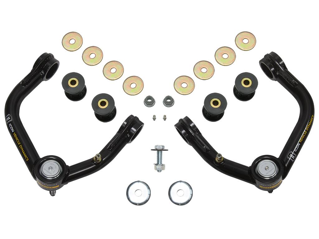 These upper control arms feature ICON's patented Delta Joint. The Delta Joint is a heavy duty high angle ball joint that combines the durability of a ball joint with the performance characteristics of a traditional uniball. While the industry standard uniball does a great job of allowing the control arms of a vehicle to articulate with little bind, they do have an inherent weakness that leaves more to be desired when used in a daily driven application - exposure to the elements. The Delta Joint features a zinc plated housing providing the first layer of corrosion resistance, while a tough grease seal keeps potentially harmful elements out of the inner workings of the joint. Metal on metal construction and a greasable design increase the longevity of the Delta Joint while at the same time allowing for noise-free operation. What makes the Delta Joint unique is that it brings the best of both worlds to ICON upper control arms with features that make it more robust than a uniball, and at the same time capable of greater angularity than a typical ball joint.- Direct bolt-in design makes for a simple and straightforward installation