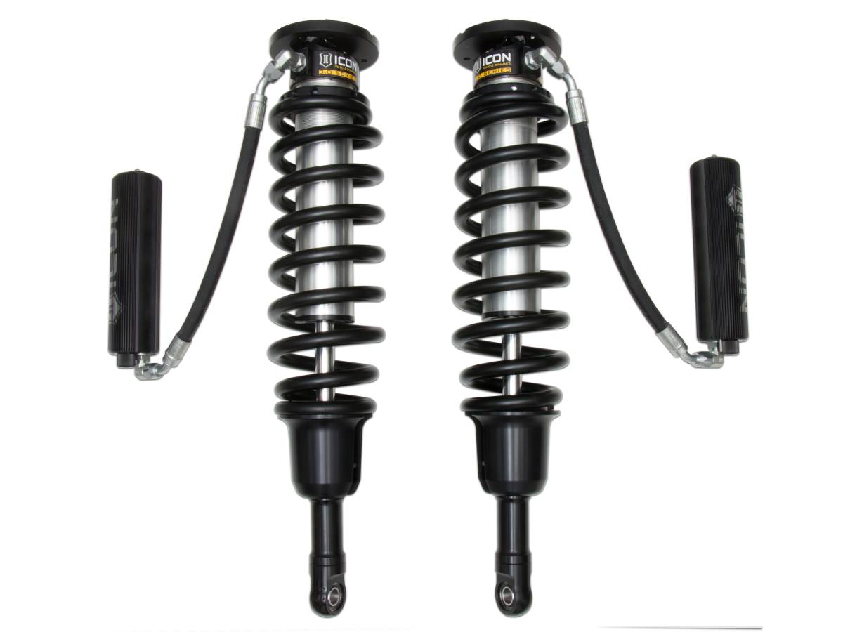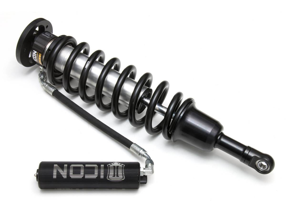 The front end geometry of the Gen 2 Raptor was found to be fairly similar to the previous model truck, however the shock mounting points had been moved higher up on the chassis. Seeing this as an opportunity, the team was able to design a 3.0 Series coilover that has more shaft travel while utilizing a barreled coil spring for more efficient packaging. The vehicle-specific valving featured in these shocks and the all new ICON-engineered spring work together to provide exceptional on-road ride quality with excellent off-road characteristics. ICON’s multi-stage hydraulic “Bump Zone” adds to the performance capability by providing an exponential increase in damping ability during the last 40% of compression travel for superior bottom-out resistance. In the ride zone, these 3.0 Series coilovers see a 50% increase in damping ability with the use of a significantly larger piston than what is found in the factory shocks. New 10” finned aluminum reservoirs provide a generous amount of shock oil while also providing an increase in surface area for enhanced cooling and consistent damping. The addition of ICON’s CDC Valve technology provides 10 settings of damping adjustment allowing the end-user to adjust the “feel” of the shocks for different terrains and vehicle cargo configurations. All of these features work together to deliver the perfect blend of on-road comfort and off-road performance.