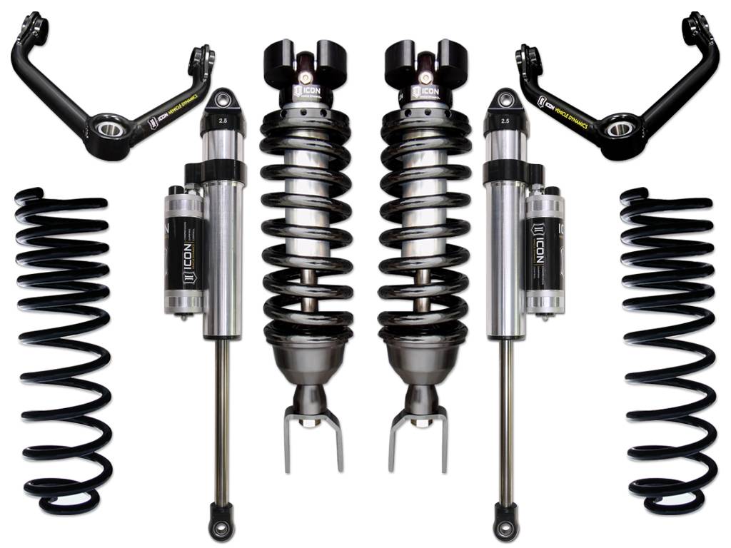 ICON Vehicle Dynamics Dodge Ram 1500 4WD suspension systems are designed with maximum performance and the serious driver in mind. ICON engineers’ primary focus is to increase wheel travel and damping ability, which translates into outstanding vehicle control and ride quality both on and off-road. This system includes vehicle-specific tuned 2.5” coilover shocks featuring an internal reservoir for exceptional cooling properties and ICON-engineered Eibach coil springs for superior vehicle “feel” through the range of travel. These coilovers are also height adjustable from .75-2.5” allowing the use of larger, more aggressive wheel and tire combinations. ICON 2.5 Aluminum Series rear shocks with CDC Valve utilize a vehicle-specific valving that balances the performance of the truck from front to rear. The ICON Vehicle Dynamics 2009-2018 Dodge Ram 1500 4WD Stage 5 suspension system is an excellent choice for those drivers looking to enhance the capabilities of their pickup on the road as well as in the dirt.