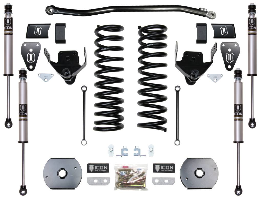 ICON Vehicle Dynamics suspension systems for the 2014-2018 Ram 2500 4WD were designed with exceptional performance and ride quality in mind. This Stage 1 system includes ICON-engineered 4.5” dual rate coil springs, high-strength laser cut bracketry, billet bump stop spacers, fabricated rear coil spacers, and all hardware necessary for a complete install. Vehicle-specific ICON 2.0 Aluminum Series shocks help deliver balanced performance front to rear, making it the perfect suspension system for any 2014-UP Ram 2500 4WD that's tasked with daily driving, towing, and light off-road use.