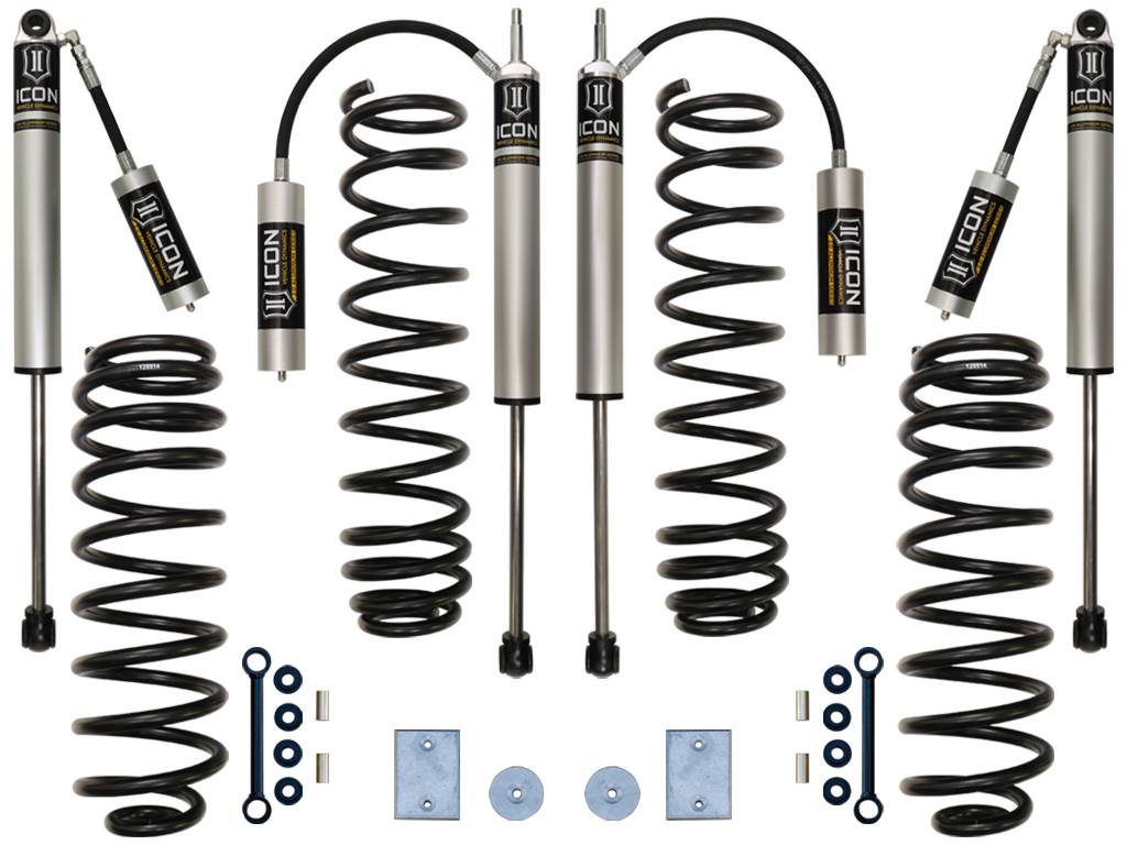 The ICON Vehicle Dynamics 3" Lift Suspension System is designed for Jeep JK owner's demanding the ultimate in performance and ride quality, without the larger stance you find in bigger lift systems on today's market. ICON's Jeep Wrangler JK 3" lift system is engineered with front and rear dual rate progressive wound springs which is the foundation for on and off-road performance and suspension articulation. The dual rate design gives you a softer initial rate for superb on road comfort and a firmer secondary rate that increases during compression for excellent bottom out control. ICON V.S. 2.0 Aluminum Series Remote Reservoir shocks add the finishing touch with OE mounting, aircraft grade components, and vehicle specific valving. Remote Reservoir shocks are great for additional heat dissipation to prevent shock fade during off road use. Together the combination of ICON dual rate coils and V.S. 2.0 Aluminum Series shocks adds 30% more wheel travel over stock, helping you rock crawl safer or soak up larger terrain at higher speeds keeping those wheels on the ground. This ICON 3" JK lift system is designed from the ground up to give the Jeep Wrangler JK's the best performance, suspension handling / ride quality, and clearance for 33" tall tires (35" tall with installation of aftermarket high-clearance fenders).
