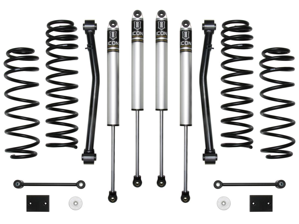 The ICON Vehicle Dynamics Stage 2 2.5" Suspension System for the 2018-UP Jeep Wrangler JL is designed for the driver looking to drastically improve the performance and ride quality of their vehicle. This Stage 2 system includes 2.5" lift dual rate coil springs, Vehicle Specific 2.0 Aluminum Series shocks, tubular steel front lower links, bump stop spacers, sway bar links, and all necessary hardware to complete the installation. With this combination of components, ICON was able to increase wheel travel numbers by over 30% (3" front, 2" rear), redefining the potential of the 2018-UP JL. The front lower links included with this system are constructed from thick wall steel tubing, provide increased castor numbers, and feature dual durometer bushings for noise free operation, maximum articulation, and minimal bind. The Stage 2 system allows for fitment of 35" tires when used with ICON's recommended wheel specifications. For users looking to install 37" tires, an optional bump stop spacer kit (PN: 22029) is available.