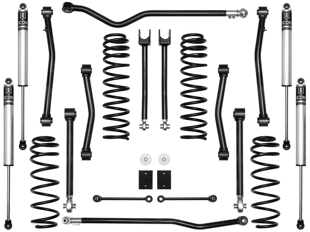 The ICON Vehicle Dynamics Stage 4 2.5" Suspension System for the 2018-UP Jeep Wrangler JL is designed for the driver looking to drastically improve the performance and ride quality of their vehicle. This Stage 4 system includes 2.5" lift dual rate coil springs, Vehicle Specific 2.0 Aluminum Series shocks, tubular steel adjustable front upper links, fixed front lower links, fixed rear upper links, adjustable rear lower links, adjustable front and rear track bars, bump stop spacers, sway bar links, and all necessary hardware to complete the installation. With this combination of components, ICON was able to increase wheel travel numbers by over 30% (3" front, 2" rear), redefining the potential of the 2018-UP JL. The front lower links included with this system are constructed from thick wall steel tubing, provide increased castor numbers, and feature dual durometer bushings for noise free operation, maximum articulation, and minimal bind. The Stage 4 system allows for fitment of 35" tires when used with ICON's recommended wheel specifications. For users looking to install 37" tires, an optional bump stop spacer kit (PN: 22029) is available.Holistic Engineering - the ICON Difference: When developing suspension components for a new vehicle, ICON takes a different approach than many others. Rather than focusing in on one particular part, ICON engineers look at the vehicle as a whole, identify inherent strengths and weaknesses, and set a target for performance. With a focus on maximizing wheel travel and improving ride quality, ICON will develop components that address (and often times replace) OE limiting factors. This "holistic engineering" philosophy often results in the development of several parts designed to work together as a system to provide a balanced on and off-road performance upgrade. Because ICON is designing and manufacturing all of the components necessary to improve the performance of a vehicle from front to back, end-users can rest easy knowing they are dealing with ONE manufacturer, ONE standard of quality, and ONE awesome warranty to back it all up.- 2.5" lift height
