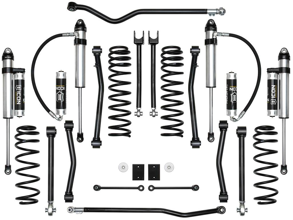 The ICON Vehicle Dynamics Stage 7 2.5" Suspension System for the 2018-UP Jeep Wrangler JL is designed for the driver looking to drastically improve the performance and ride quality of their vehicle. This Stage 7 system includes 2.5" lift dual rate coil springs, upgraded 2.5 Aluminum Series remote reservoir shocks with vehicle specific valving, tubular steel adjustable front upper links, fixed front lower links, fixed rear upper links, adjustable rear lower links, adjustable front and rear track bars, bump stop spacers, sway bar links, and all necessary hardware to complete the installation. With this combination of components, ICON was able to increase wheel travel numbers by over 30% (3" front, 2" rear), redefining the potential of the 2018-UP JL. The Stage 7 system allows for fitment of 35" tires when used with ICON's recommended wheel specifications. For users looking to install 37" tires, an optional bump stop spacer kit (PN: 22029) is available.