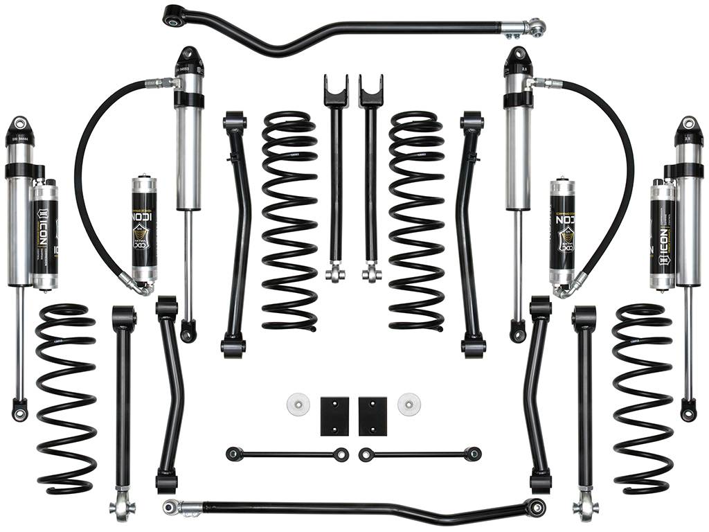 The ICON Vehicle Dynamics Stage 8 2.5" Suspension System for the 2018-UP Jeep Wrangler JL is designed for the driver looking to drastically improve the performance and ride quality of their vehicle. This Stage 8 system includes 2.5" lift dual rate coil springs, upgraded 2.5 Aluminum Series remote reservoir shocks with vehicle specific valving and ICON's CDC (Compression Damping Control) technology, tubular steel adjustable front upper links, fixed front lower links, fixed rear upper links, adjustable rear lower links, adjustable front and rear track bars, bump stop spacers, sway bar links, and all necessary hardware to complete the installation. With this combination of components, ICON was able to increase wheel travel numbers by over 30% (3" front, 2" rear), redefining the potential of the 2018-UP JL. The front lower links included with this system are constructed from thick wall steel tubing, provide increased castor numbers, and feature dual durometer bushings for noise free operation, maximum articulation, and minimal bind. The Stage 8 system allows for fitment of 35" tires when used with ICON's recommended wheel specifications. For users looking to install 37" tires, an optional bump stop spacer kit (PN: 22029) is available.