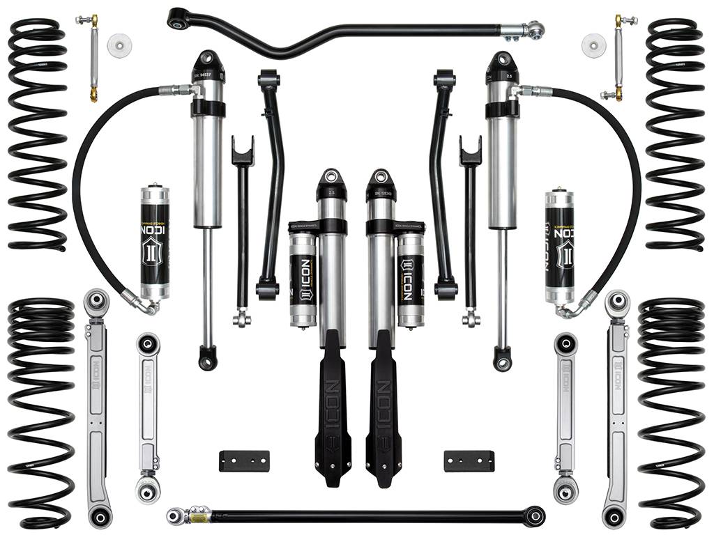 The Stage 7 ICON 2.5” Suspension System for the Jeep Gladiator is the ideal setup for drastically improving off-road performance and overall ride quality for the application that will see frequent heavy off-road use. This complete suspension system features ICON’s proven 2.5 Aluminum Series shocks, 2.5” lift dual-rate front coil springs, tubular steel fixed lower and adjustable upper front links, billet front sway bar links, a triple-rate rear coil spring kit, billet aluminum adjustable upper and lower rear links, a rear sway bar relocation kit, front and rear adjustable track bars, and all necessary hardware for install. This system provides an increase of over 30% front and 20% rear wheel travel and was designed around the use of a 35” tire. For those looking to run a 37” tire this can be achieved with the ICON Jeep JT Bump Stop Spacer Kit (Part #22071).