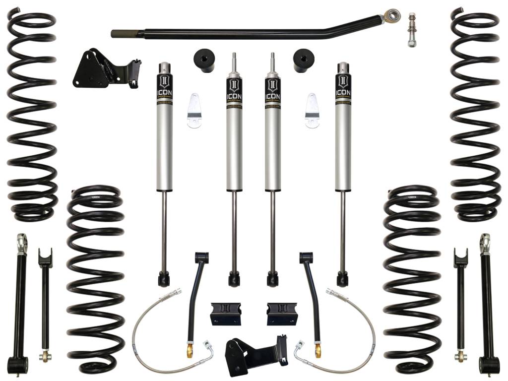 The ICON Stage 1 Jeep JK 4.5" suspension system includes dual-rate coil springs, track bar drop brackets, high-steering components, bumpstop spacers, rear brake lines, rear sway bar links, adjustable front upper and rear lower links, and 2.0 Aluminum Series IFP shocks. Tested and tuned, the ICON JK Stage 1 suspension system offers stability and drivability over a wide range of off road terrains, while keeping a smooth onroad feel for every day driving. Installing this kit allows proper clearance for 35" tall tires with no modifications and 37" tires with aftermarket high clearance fenders.- Dual-rate coil springs front and rear guaranteed never to sag