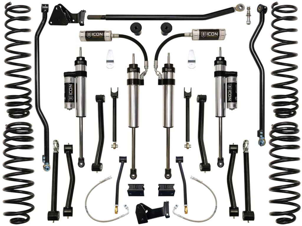 The ICON Stage 3 Jeep JK 4.5" suspension system includes dual-rate coil springs, track bar drop brackets, high-steering components, bump stop spacers, rear brake lines, rear sway bar links, complete set of front and rear links, and 2.5 Series reservoir shocks. Tested and tuned, the ICON JK Stage 3 suspension system offers stability and drivability over a wide range of off-road terrains, while keeping a smooth on road feel for every day driving. This system includes 2.5" remote reservoir shocks front and rear to ensure optimum performance by increasing the duration of consistent damping regardless of situation, keeping the shocks at a cooler operating temperature during heavy use. Installing this kit allows proper clearance for 35" tall tires with no modifications and 37" tires with aftermarket high clearance fenders.- Dual-rate coil springs front and rear guaranteed never to sag