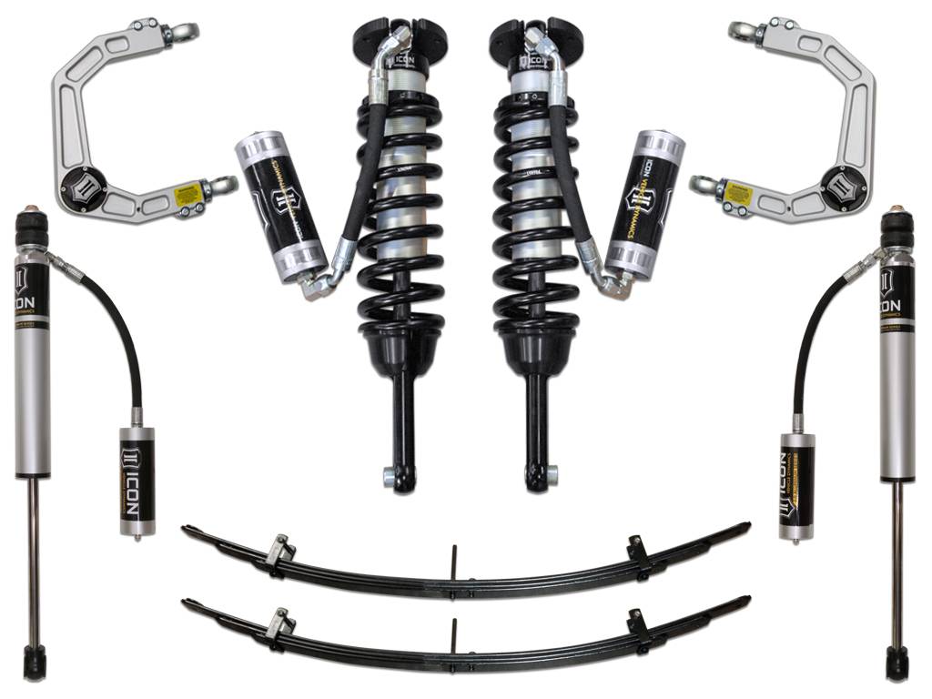 ICON Vehicle Dynamics 2005-UP Toyota Tacoma suspension systems are designed with maximum performance and the serious driver in mind. ICON engineers’ primary focus is to increase wheel travel and damping ability, which translates into outstanding vehicle control and ride quality both on and off-road. The Stage 4 system includes vehicle-specific tuned 2.5” Extended Travel coilover shocks featuring a remote reservoir for exceptional cooling properties and ICON-engineered Eibach coil springs for superior vehicle “feel” through the range of travel. These coilovers are also height adjustable from 0-3.5” of lift on 2005-2015 or 0-2.75” on 2016-UP models allowing the use of larger, more aggressive wheel and tire combinations. When used with an ICON upper control arm, ICON extended travel coilovers add increased droop travel to the front suspension. ICON 2.0 Aluminum Series Remote Reservoir rear shocks utilize a vehicle-specific valving that balances the performance of the truck from front to rear. The ICON Vehicle Dynamics 2005-UP Toyota Tacoma 4WD/PreRunner Stage 4 suspension system is an excellent choice for those drivers looking to enhance the capabilities of their pickup on the road as well as in the dirt.
