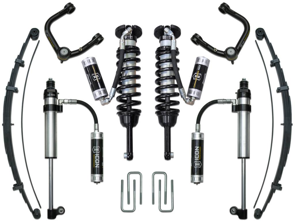 ICON Vehicle Dynamics 2005-UP Toyota Tacoma suspension systems are designed with maximum performance and the serious driver in mind. Throughout the development of these systems ICON engineers’ primary focus is to increase wheel travel and damping ability, which translates into outstanding vehicle control and ride quality both on and off-road. This Stage 8 system goes a step further in delivering ICON performance to the Tacoma with the addition of rear suspension components that include an ICON RXT multi-rate leaf spring and a unique RXT-specific 2.5 Aluminum Series shock.