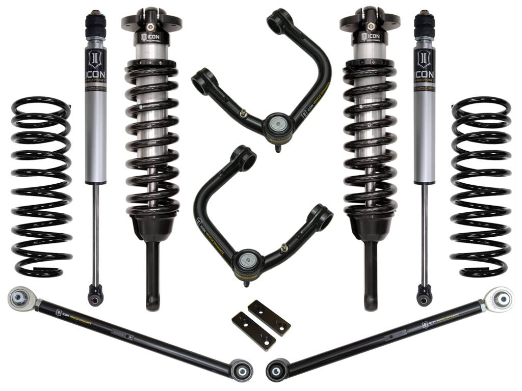 The Stage 3 suspension system for the 2010-UP Toyota 4Runner/2010-2014 FJ Cruiser includes the components found in the Stage 2 system along with an ICON Tubular Steel Rear Lower Link kit. Extended travel ICON 2.5 Series coilover shocks and a tubular steel Delta Joint upper control arm kit provide a significant upgrade to the 4Runner’s front suspension. The rear of the vehicle is improved with our 2" lift coil springs, ICON 2.0 Aluminum Series shocks, and the additional rear lower links. ICON's tubular steel lower links are much stronger than the OE units, feature a low maintenance multi-durometer bushing, and can be adjusted for optimum pinion angle. On top of it all, these links have been designed to provide correct roll steer geometry for the best possible handling on and off-road.