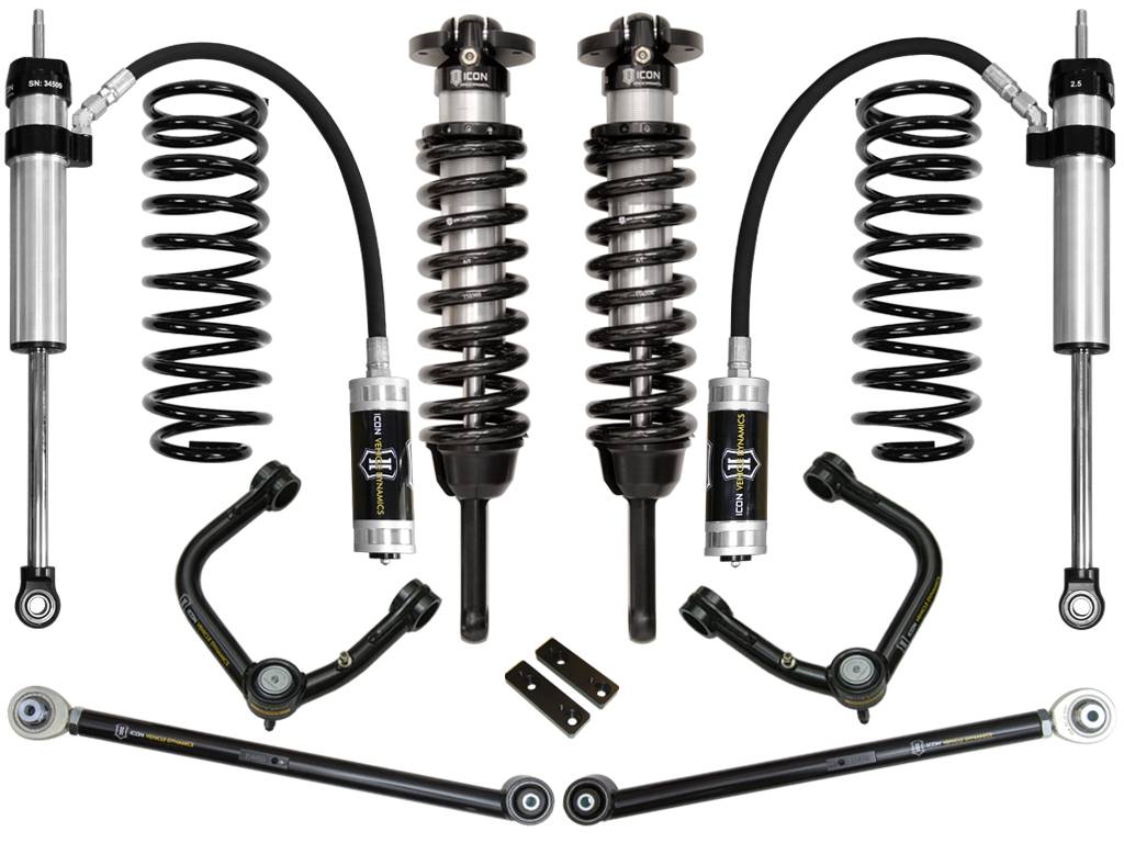 This system features upper control arms with ICON's patented Delta Joint. The Delta Joint is a heavy-duty high angle ball joint that combines the durability of a ball joint with the performance characteristics of a traditional uniball. While the industry standard uniball does a great job of allowing the control arms of a vehicle to articulate with little bind, they do have an inherent weakness that leaves more to be desired when used in a daily driven application - exposure to the elements. The Delta Joint features a zinc plated housing providing the first layer of corrosion resistance, while a tough grease seal keeps potentially harmful elements out of the inner workings of the joint. Metal on metal construction and a greaseable design increase the longevity of the Delta Joint while at the same time allowing for noise-free operation. What makes the Delta Joint unique is that it brings the best of both worlds to ICON upper control arms with features that make it more robust than a uniball, and at the same time capable of greater angularity than a typical ball joint.- Increased wheel travel and ride quality over stock