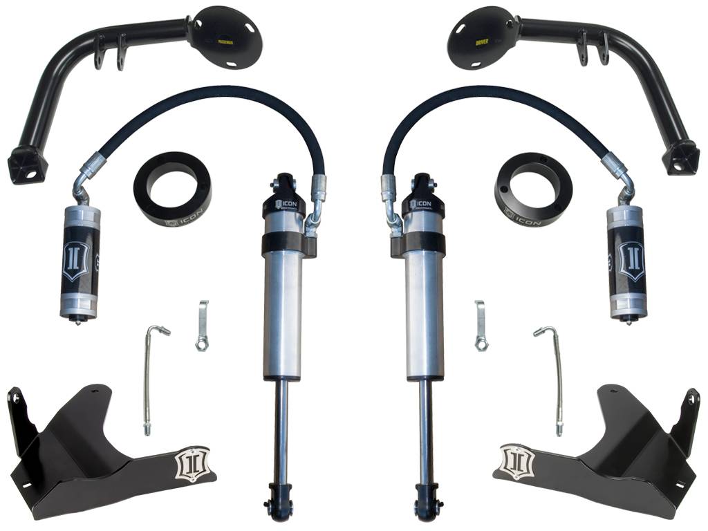 The S2 Secondary Shock System utilizes the factory lower control arms and maintains OE track width while a combination of a billet aluminum shock tower adapters, fabricated shock hoops, and steel skid plates (with incorporated shock mounts) make for a straightforward install with the exceptional build quality you would expect from an ICON Vehicle Dynamics product. The system was designed to eliminate the need for any major alteration of the vehicle’s frame or any other factory suspension components, and the components are 100% removable in case the system is to be installed on another vehicle. The modular design of the S2 kit also allows for standalone installation of the skid plates, which provides the added benefit of protecting the factory lower control arms from potential trail damage that can be experienced while off-road.- Drastically improves vehicle damping ability off-road