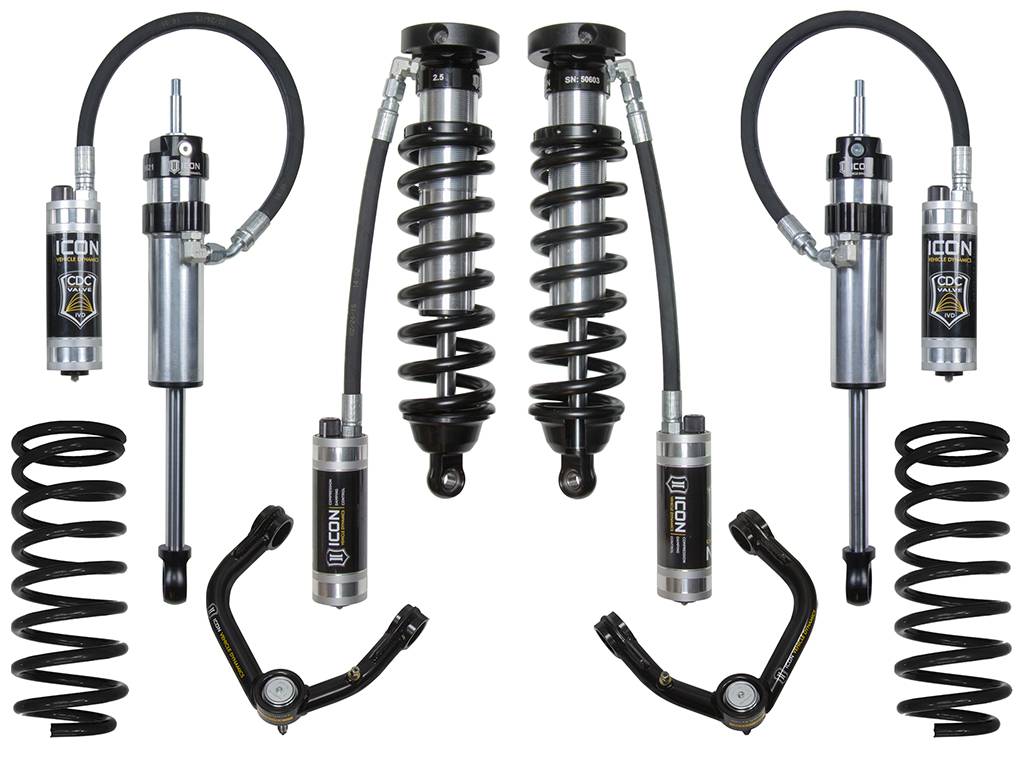 This system features upper control arms with ICON's patented Delta Joint. The Delta Joint is a heavy-duty high angle ball joint that combines the durability of a ball joint with the performance characteristics of a traditional uniball. While the industry standard uniball does a great job of allowing the control arms of a vehicle to articulate with little bind, they do have an inherent weakness that leaves more to be desired when used in a daily driven application - exposure to the elements. The Delta Joint features a zinc plated housing providing the first layer of corrosion resistance, while a tough grease seal keeps potentially harmful elements out of the inner workings of the joint. Metal on metal construction and a greaseable design increase the longevity of the Delta Joint while at the same time allowing for noise-free operation. What makes the Delta Joint unique is that it brings the best of both worlds to ICON upper control arms with features that make it more robust than a uniball, and at the same time capable of greater angularity than a typical ball joint.- Increased wheel travel and ride quality over stock