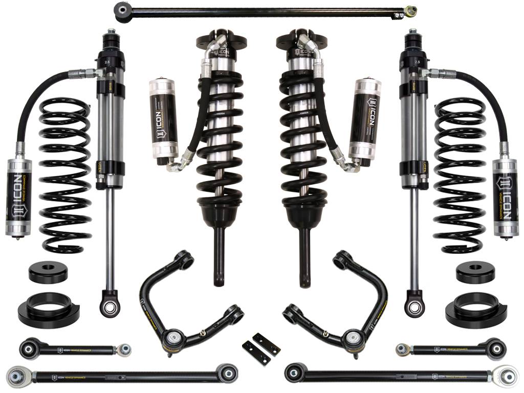 This system features upper control arms with ICON's patented Delta Joint. The Delta Joint is a heavy-duty high angle ball joint that combines the durability of a ball joint with the performance characteristics of a traditional uniball. While the industry standard uniball does a great job of allowing the control arms of a vehicle to articulate with little bind, they do have an inherent weakness that leaves more to be desired when used in a daily driven application - exposure to the elements. The Delta Joint features a zinc plated housing providing the first layer of corrosion resistance, while a tough grease seal keeps potentially harmful elements out of the inner workings of the joint. Metal on metal construction and a greaseable design increase the longevity of the Delta Joint while at the same time allowing for noise-free operation. What makes the Delta Joint unique is that it brings the best of both worlds to ICON upper control arms with features that make it more robust than a uniball, and at the same time capable of greater angularity than a typical ball joint.- Increased wheel travel and ride quality over stock