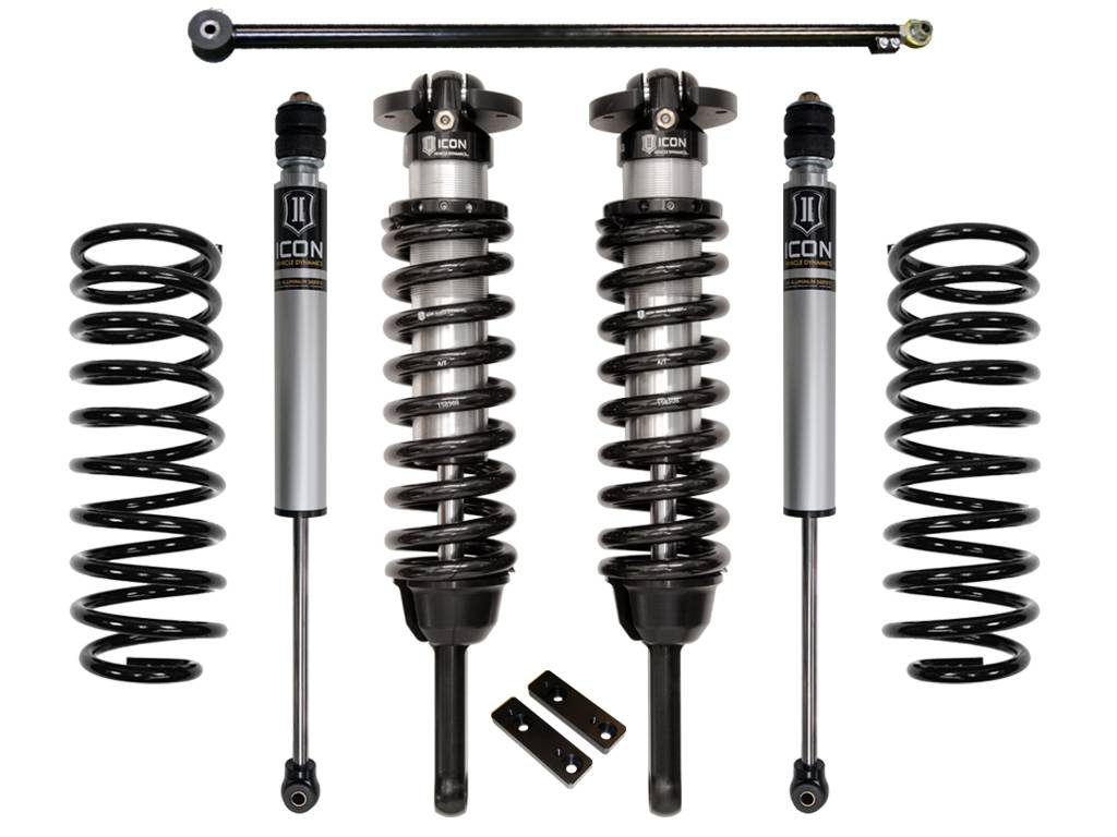 The Stage 1 system includes vehicle-specific tuned 2.5” coilover shocks featuring an internal reservoir for exceptional cooling properties and ICON-engineered coil springs for superior vehicle “feel” through the range of travel. These coilovers are also height adjustable from 0-3.5” of lift over stock, allowing the use of larger, more aggressive wheel and tire combinations. ICON 2” lift rear coil springs paired with 2.0 Aluminum Series internal reservoir rear shocks utilizing vehicle-specific valving balance the performance of the truck from front to rear. Specifically for the GX460 platforms an adjustable rear track bar is included for KDSS compatibility that also helps correct rear end alignment. The ICON Vehicle Dynamics 2010-UP Lexus GX460 Stage 1 suspension system is an excellent choice for those drivers looking to enhance the capabilities of their pickup on the road as well as in the dirt.