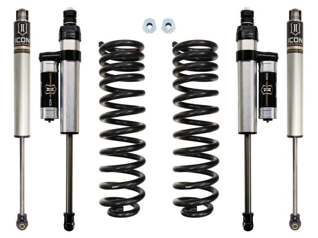 The ICON 2.5” suspension system is a great way to level your 4WD 2005-2016 Ford F250/350 Super Duty while improving ride quality and performance. This Stage 2 system is great for towing, rough construction site terrains, and country dirt roads all while keeping a smooth highway feel. ICON's Stage 2 System is comprised of dual rate coil springs, alignment cams for adding caster, and ICON 2.5 Aluminum Series piggyback reservoir shocks up front and 2.0 Aluminum Series internal reservoir shocks in the rear. ICON 2.5" reservoir shocks up front ensure optimum performance by increasing the duration of consistent damping regardless of situation, keeping the shocks at a cooler operating temperature during heavy use. With the endless hours ICON has spent testing and tuning our suspension components and shocks as a complete package, you can rest assured you have the best suspension solution on the market.