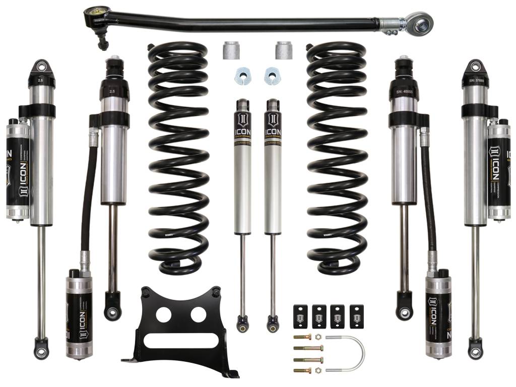 This ICON Vehicle Dynamics 2.5” suspension system is the best way to level your 4WD 2017-2019 Ford F250/350 Super Duty while drastically improving ride quality and performance. The Stage 5 system is perfect for on-road and off-road use including towing, job site duty, and hardcore off-road adventure. This Stage 5 System combines dual rate coil springs, alignment cams, CDC Valve 2.5 Aluminum Series front remote reservoir and rear piggyback reservoir shocks, an all-new adjustable track bar designed specifically for the 2017-UP Super Duty, and ICON's dual opposing 2.0 Aluminum Series steering stabilizer kit for the ultimate in on-road comfort and off-road performance. With the endless hours ICON has spent testing and tuning our suspension components and shocks as a complete package, you can be rest assured you have the best suspension solution on the market.