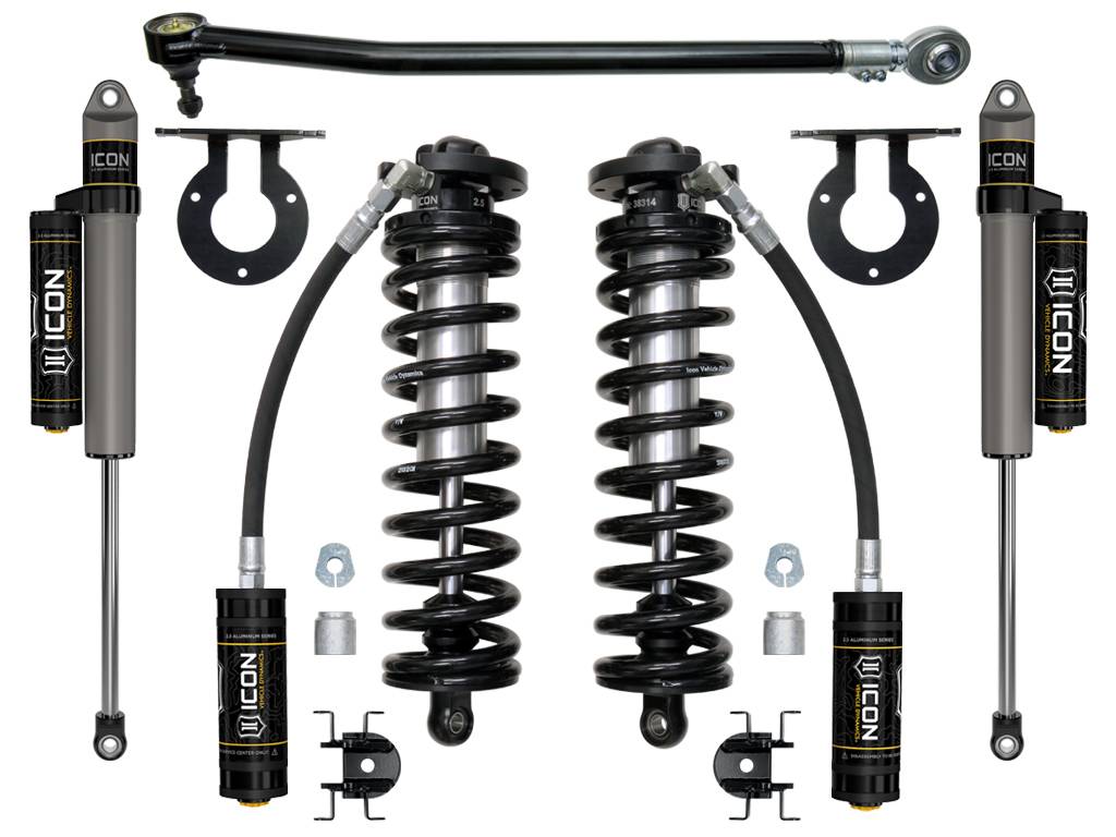 ICON's 2.5 VS Series Remote Reservoir Bolt-In Coilover Conversion Kit will add a new level of performance and adjustability to 2017-UP F-250 and F-350 trucks. The advantage of utilizing a coilover conversion kit is that they have been designed to increase the overall damping ability of the vehicle while at the same time allowing for user-defined ride height adjustment. The 2.5" Remote Reservoir Coilover featured in these kits is based off of ICON’s 2.5 VS Series shock line - meaning that features like Eibach coil springs, FK Rod End bearings, and vehicle-specific valving come standard. Rear 2.5 Aluminum Series piggyback shocks feature one-piece impact extruded aluminum cylinders that offer lighter weight, improved corrosion resistance, and a more uniform finish than traditional plated steel cylinders. Quality machined components and a fully serviceable design make for a product that will stand the test of time, yet retain the ability to be rebuilt or re-valved as necessary.