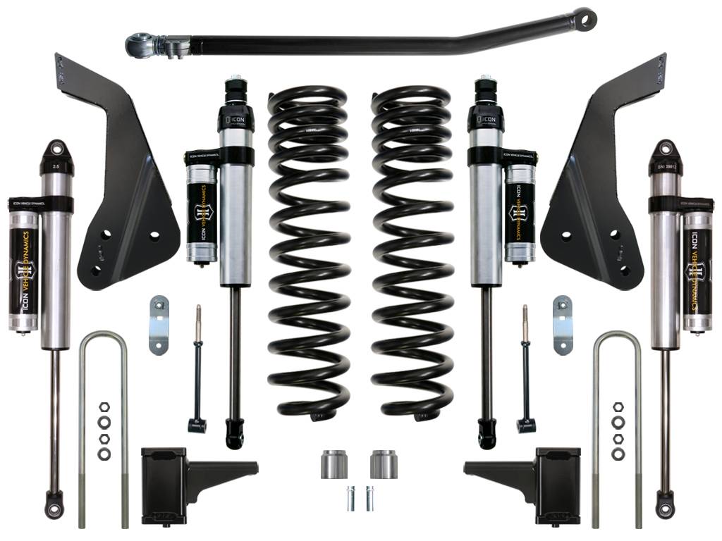 This 4.5" System for the 2005-2007 Super Duty is one the best riding suspension systems ICON has ever developed. This system has been engineered using the highest quality materials and components. The Dual-Rate front coil springs combined with our ICON 2.5 Aluminum Series piggyback reservoir shocks give these trucks the performance they so desperately need. This system comes complete with front coils, shocks, radius arm drop down brackets, rear blocks and U-bolts and our patented adjustable track bar giving the front end of these trucks perfect track alignment.