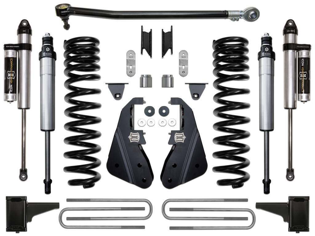 This ICON Vehicle Dynamics 4.5” suspension system is a great way to lift your 4WD 2017-2019 Ford F250/350 Super Duty while drastically improving ride quality and performance. The Stage 2 system is perfect for on-road and off-road use including towing, job site duty and general off-road adventure. ICON's Stage 2 System is comprised of dual rate coil springs, radius arm drop brackets, adjustable track bar, 5" block kit, and ICON 2.5 Aluminum Series internal reservoir front and piggyback reservoir rear shocks. With the endless hours ICON has spent testing and tuning our suspension components and shocks as a complete package, you can rest assured you have the best suspension solution on the market.
