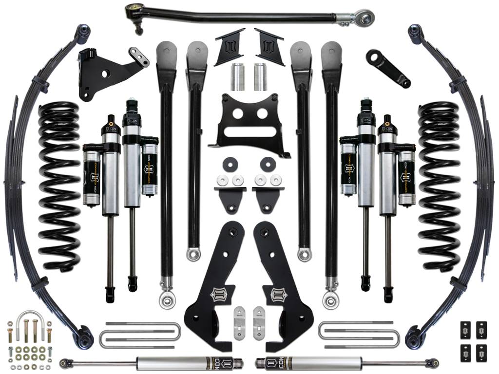 This ICON Vehicle Dynamics 7” suspension system is a great way to lift your 4WD 2017-UP Ford F250/350 Super Duty while drastically improving ride quality and performance. This suspension system is perfect for on-road and off-road use including towing, job site duty, and hardcore off-road adventure. ICON's 7" Stage 4 System is comprised of dual rate coil springs, progressive leaf springs, 4-Link kit, adjustable track bar, dual opposing steering stabilizer kit, ICON 2.5 Aluminum Series piggyback reservoir front and rear shocks, plus all of the necessary hardware for installation.