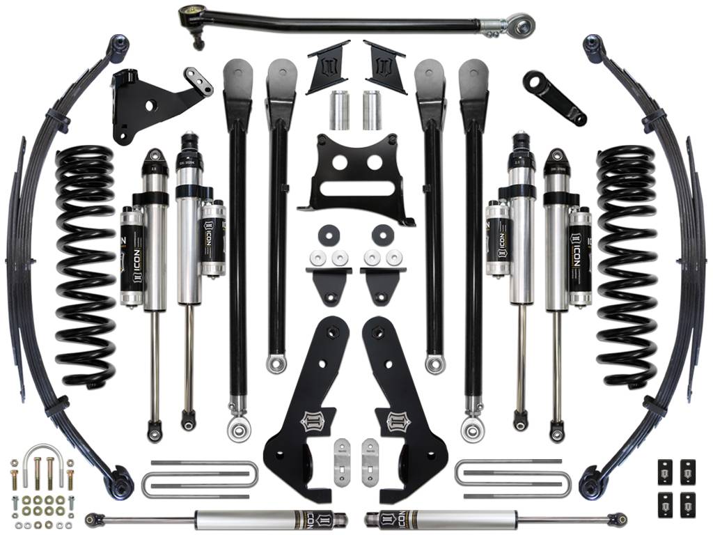 This ICON Vehicle Dynamics 7” suspension system is a great way to lift your 4WD 2017-UP Ford F250/350 Super Duty while drastically improving ride quality and performance. This suspension system is perfect for on-road and off-road use including towing, job site duty, and provides ultimate performance for extreme off-road adventure. ICON's 7" Stage 5 System is comprised of dual rate coil springs, progressive leaf springs, 4-Link kit, adjustable track bar, dual opposing steering stabilizer kit, ICON CDC Valve equipped 2.5 Aluminum Series piggyback reservoir front and rear shocks, plus all of the necessary hardware for installation.