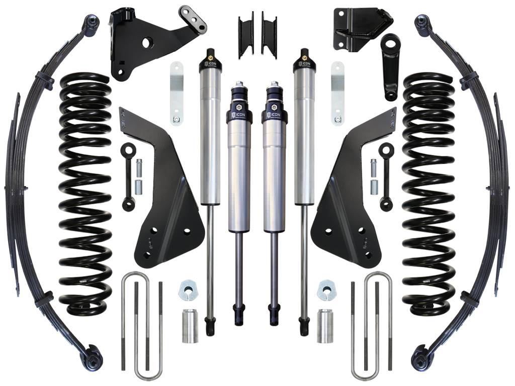 ICON Vehicle Dynamics is an industry leader when it comes to Ford Super Duty performance. Our engineers have spent countless hours under these trucks and behind the wheel developing some of the most refined suspension systems available. Increasing wheel travel and ride comfort is standard operating procedure at ICON, but our engineers aimed high to produce a suspension solution that also maintained the Super Duty’s towing capacity. ICON’s 7” Suspension System for the 08-10 Super Duty yields enough lift to clear 37” tires while providing excellent ride characteristics across a wide variety of terrain on and off-road. Each component of this suspension system has been specifically engineered to work in union with other ICON parts to extract maximum performance out of the vehicle. Our Stage 3 System is comprised of 7” lift dual rate coil springs, fabricated radius arm drop mounts with brushed stainless badges, track bar drop bracket, bump stop extensions, sway bar links, a forged pitman arm, brake line brackets, rear 5" lift progressive rate leaf springs w/ U-bolts, and 2.5 Aluminum Series smooth body IFP front & rear shocks. ICON 2.5" body shocks offer additional damping capability to ensure optimum performance during heavy on or off-road use.