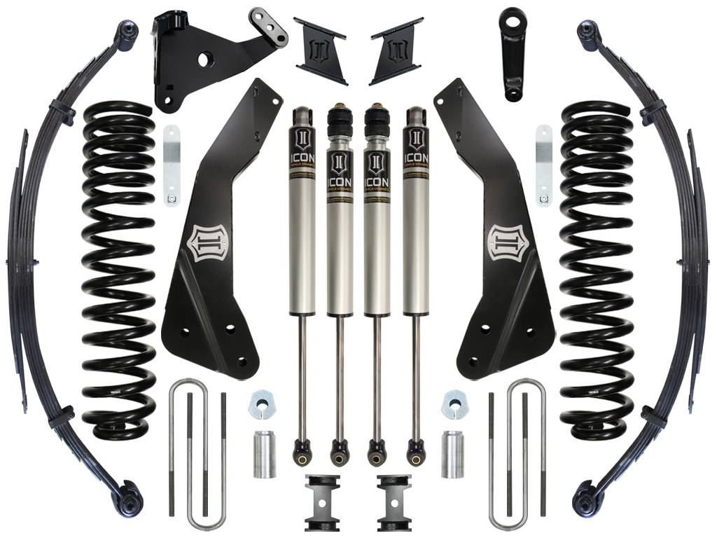 ICON Vehicle Dynamics is an industry leader when it comes to Ford Super Duty performance. Our engineers have spent countless hours under these trucks and behind the wheel developing some of the most refined suspension systems available. Increasing wheel travel and ride comfort is standard operating procedure at ICON, but our engineers aimed high to produce a suspension solution that also maintained the Super Duty’s towing capacity. ICON’s 7” Suspension System for the 2011-2016 Super Duty yields enough lift to clear 37” tires while providing excellent ride characteristics across a wide variety of terrain on and off-road. Each component of this suspension system has been specifically engineered to work in union with other ICON parts to extract maximum performance out of the vehicle. Our Stage 2 System is comprised of 7” lift dual rate coil springs, fabricated radius arm drop mounts with brushed stainless badges, track bar drop bracket, bump stop extensions, sway bar links, a forged pitman arm, brake line brackets, rear 5" lift progressive rate leaf springs w/ U-bolts, and 2.0 Aluminum Series smooth body front & rear shocks.