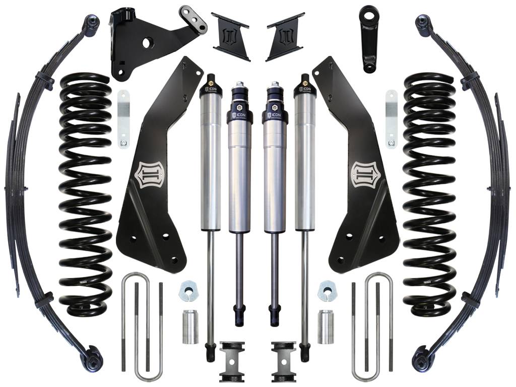 ICON Vehicle Dynamics is an industry leader when it comes to Ford Super Duty performance. Our engineers have spent countless hours under these trucks and behind the wheel developing some of the most refined suspension systems available. Increasing wheel travel and ride comfort is standard operating procedure at ICON, but our engineers aimed high to produce a suspension solution that also maintained the Super Duty’s towing capacity. ICON’s 7” Suspension System for the 2011-2016 Super Duty yields enough lift to clear 37” tires while providing excellent ride characteristics across a wide variety of terrain on and off-road. Each component of this suspension system has been specifically engineered to work in union with other ICON parts to extract maximum performance out of the vehicle. Our Stage 3 System is comprised of 7” lift dual rate coil springs, fabricated radius arm drop mounts with brushed stainless badges, track bar drop bracket, bump stop extensions, sway bar links, a forged pitman arm, brake line brackets, rear 5" lift progressive rate leaf springs w/ U-bolts, and 2.5 Aluminum Series smooth body IFP front & rear shocks. ICON 2.5" body shocks offer additional damping capability to ensure optimum performance during heavy on or off-road use.