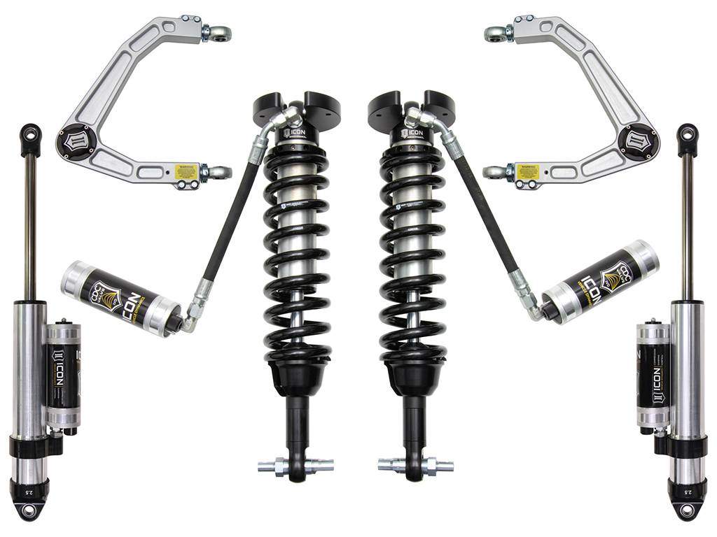 ICON Vehicle Dynamics 2019-UP GM Silverado/Sierra 1500 suspension systems are designed to dramatically increase the on and off-road ride quality. ICON engineers’ primary focus is to increase wheel travel and damping ability, which translates into outstanding vehicle control and ride quality both on and off-road. With wheel travel and ride quality in mind, ICON engineers researched each component of the GM platform’s suspension and addressed any areas where performance could be extracted. The Stage 4 system provides a higher level of performance that will drastically improve overall on and off-road vehicle ride characteristics. The ICON 2.5 Series remote reservoir coilovers and 2.5 Series piggyback rear shocks in this system provide exceptional cooling properties, with the coilovers utilizing ICON-engineered Eibach coil springs for superior vehicle “feel” throughout the range of travel. Remote reservoirs front and rear ensure optimum performance by increasing the duration of consistent damping, keeping the shocks at a cooler operating temperature during extended offroad use. These 2.5 Series remote reservoir CDCV coilovers are also height adjustable from 1.5-3.5" allowing the use of larger, more aggressive wheel and tire combinations when desired. The ICON Vehicle Dynamics 2019-UP GM Silverado/Sierra 1500 Stage 4 suspension system is an excellent choice for those drivers looking to enhance the capabilities of their pickup on the road as well as optimum performance in the dirt.