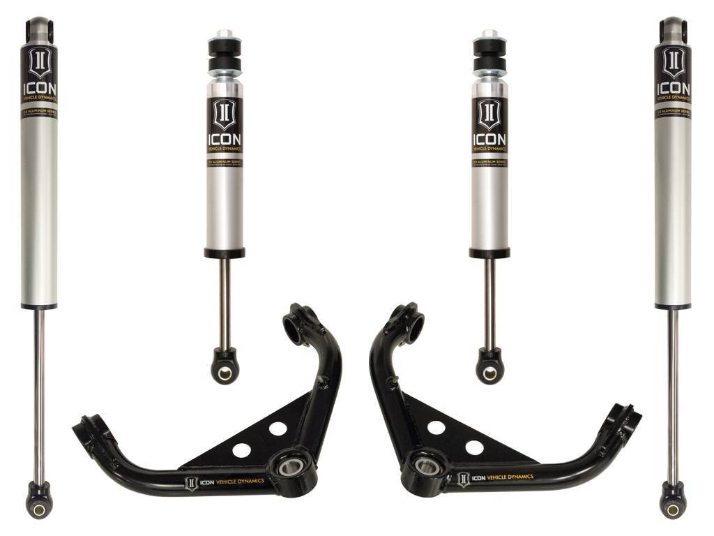 This system features upper control arms with ICON's patented Delta Joint. The Delta Joint is a heavy-duty high angle ball joint that combines the durability of a ball joint with the performance characteristics of a traditional uniball. While the industry standard uniball does a great job of allowing the control arms of a vehicle to articulate with little bind, they do have an inherent weakness that leaves more to be desired when used in a daily driven application - exposure to the elements. The Delta Joint features a zinc plated housing providing the first layer of corrosion resistance, while a tough grease seal keeps potentially harmful elements out of the inner workings of the joint. Metal on metal construction and a greaseable design increase the longevity of the Delta Joint while at the same time allowing for noise-free operation. What makes the Delta Joint unique is that it brings the best of both worlds to ICON upper control arms with features that make it more robust than a uniball, and at the same time capable of greater angularity than a typical ball joint.- Vehicle specific tuned front and rear shocks for superior shock damping and control