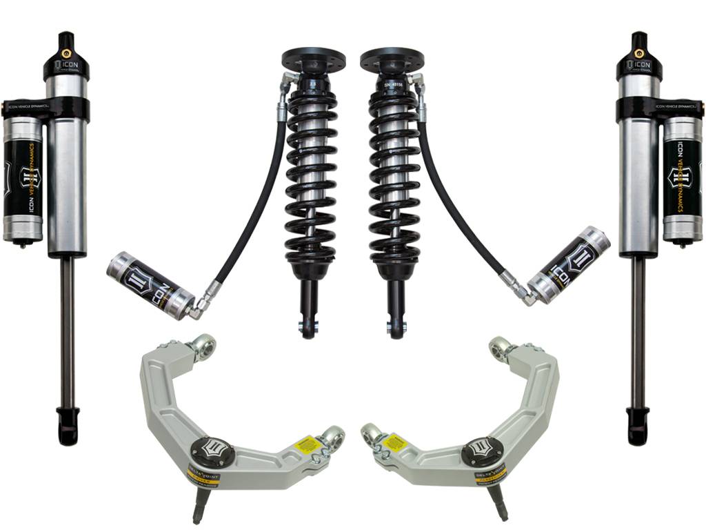 The ICON Vehicle Dynamics 2009-2013 Ford F150 4WD Stage 4 suspension system is the best choice for drivers looking to maximize the on and off-road potential of their trucks and will inspire confidence behind the wheel in nearly any situation. ICON engineers’ primary focus is to increase wheel travel and damping ability, which translates into outstanding vehicle control and ride quality both on and off-road. This system includes vehicle-specific tuned 2.5” coilover shocks featuring an external remote reservoir for exceptional cooling properties and ICON-engineered Eibach coil springs for superior vehicle “feel” through the range of travel. These coilovers are also height adjustable from 1.75-2.63” of lift over stock allowing the use of larger, more aggressive wheel and tire combinations. Billet aluminum upper control arms on the F150 not only add strength and durability, but help retain factory alignment spec range increasing caster over stock. ICON 2.5 Aluminum Series Piggyback rear shocks utilize a vehicle-specific valving that balances the performance of the truck from front to rear. 2.5" reservoir shocks front and rear ensure optimum performance by increasing the duration of consistent damping regardless of situation, keeping the shocks at a cooler operating temperature during extended off-road use. The ICON Vehicle Dynamics 2009-2013 F150 4WD Stage 4 suspension system is an excellent choice for those drivers looking to enhance the capabilities of their pickup on the road as well as in the dirt.