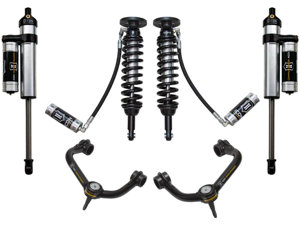 The ICON Vehicle Dynamics 2009-2013 Ford F150 4WD Stage 4 suspension system is the best choice for drivers looking to maximize the on and off-road potential of their trucks and will inspire confidence behind the wheel in nearly any situation. ICON engineers’ primary focus is to increase wheel travel and damping ability, which translates into outstanding vehicle control and ride quality both on and off-road. This system includes vehicle-specific tuned 2.5” coilover shocks featuring an external remote reservoir for exceptional cooling properties and ICON-engineered Eibach coil springs for superior vehicle “feel” through the range of travel. These coilovers are also height adjustable from 1.75-2.63” of lift over stock allowing the use of larger, more aggressive wheel and tire combinations. Tubular upper control arms on the F150 not only add strength and durability, but help retain factory alignment spec range increasing caster over stock. ICON 2.5 Aluminum Series Piggyback rear shocks utilize a vehicle-specific valving that balances the performance of the truck from front to rear. 2.5" reservoir shocks front and rear ensure optimum performance by increasing the duration of consistent damping regardless of situation, keeping the shocks at a cooler operating temperature during extended off-road use. The ICON Vehicle Dynamics 2009-2013 F150 4WD Stage 4 suspension system is an excellent choice for those drivers looking to enhance the capabilities of their pickup on the road as well as in the dirt.