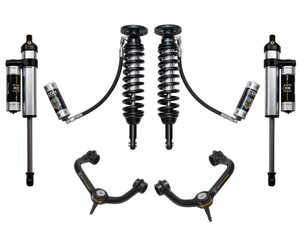 The ICON Vehicle Dynamics 2009-2013 Ford F150 2WD Stage 4 suspension system is the best choice for drivers looking to maximize the on and off-road potential of their trucks and will inspire confidence behind the wheel in nearly any situation. ICON engineers’ primary focus is to increase wheel travel and damping ability, which translates into outstanding vehicle control and ride quality both on and off-road. This system includes vehicle-specific tuned 2.5” coilover shocks featuring external remote reservoirs w/ CDCV for exceptional cooling properties and ICON-engineered Eibach coil springs for superior vehicle “feel” through the range of travel. These coilovers are also height adjustable from 1.75-2.63” of lift over stock allowing the use of larger, more aggressive wheel and tire combinations. Tubular upper control arms on the F150 not only add strength and durability, but help retain factory alignment spec range increasing caster over stock. ICON 2.5 Aluminum Series Piggyback rear shocks w/ CDCV utilize a vehicle-specific valving that balances the performance of the truck from front to rear. 2.5" CDC reservoir front and rear shocks ensure optimum performance by increasing the duration of consistent damping regardless of situation, keeping the shocks at a cooler operating temperature during heavy use. ICON's CDC Valve upgrade is included in this stage front and rear for those desiring an easy way to tune the ride externally with 10 settings from soft to hard.