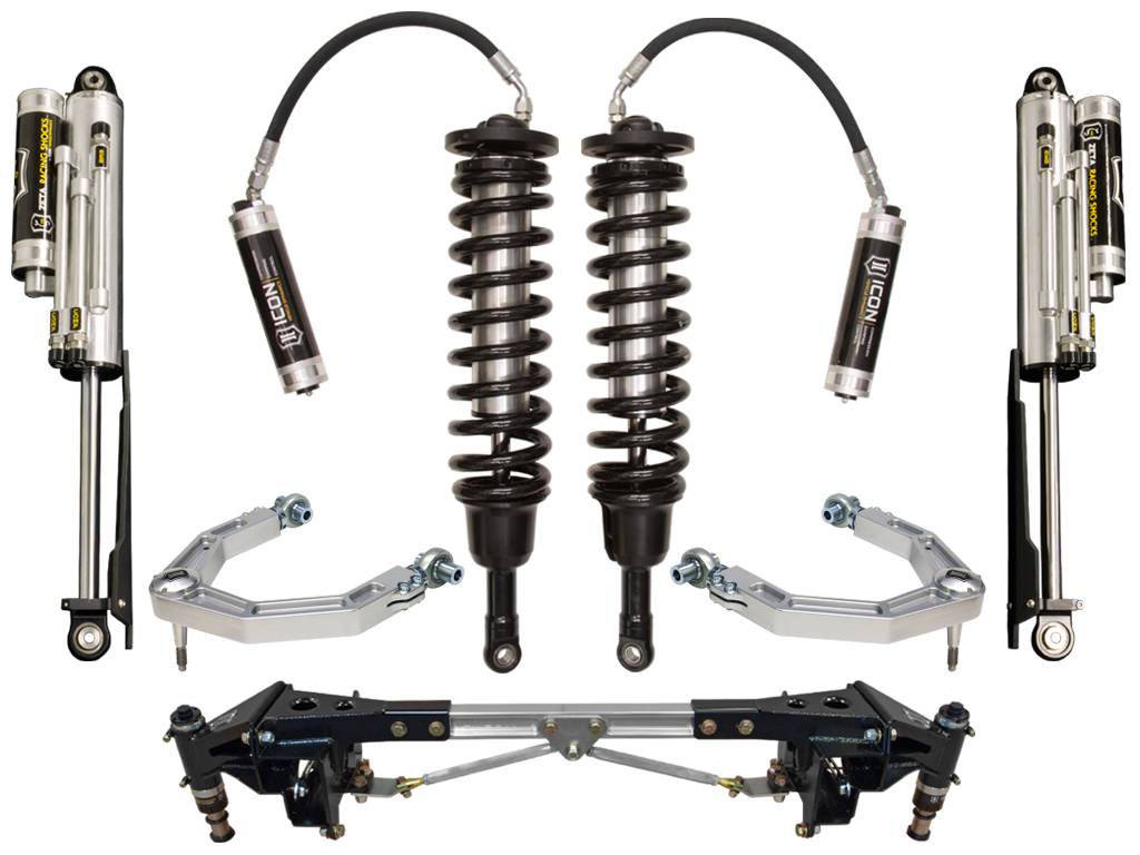 This system features upper control arms with ICON's patented Delta Joint. The Delta Joint is a heavy-duty high angle ball joint that combines the durability of a ball joint with the performance characteristics of a traditional uniball. While the industry standard uniball does a great job of allowing the control arms of a vehicle to articulate with little bind, they do have an inherent weakness that leaves more to be desired when used in a daily driven application - exposure to the elements. The Delta Joint features a zinc plated housing providing the first layer of corrosion resistance, while a tough grease seal keeps potentially harmful elements out of the inner workings of the joint. Metal on metal construction and a greaseable design increase the longevity of the Delta Joint while at the same time allowing for noise-free operation. What makes the Delta Joint unique is that it brings the best of both worlds to ICON upper control arms with features that make it more robust than a uniball, and at the same time capable of greater angularity than a typical ball joint.