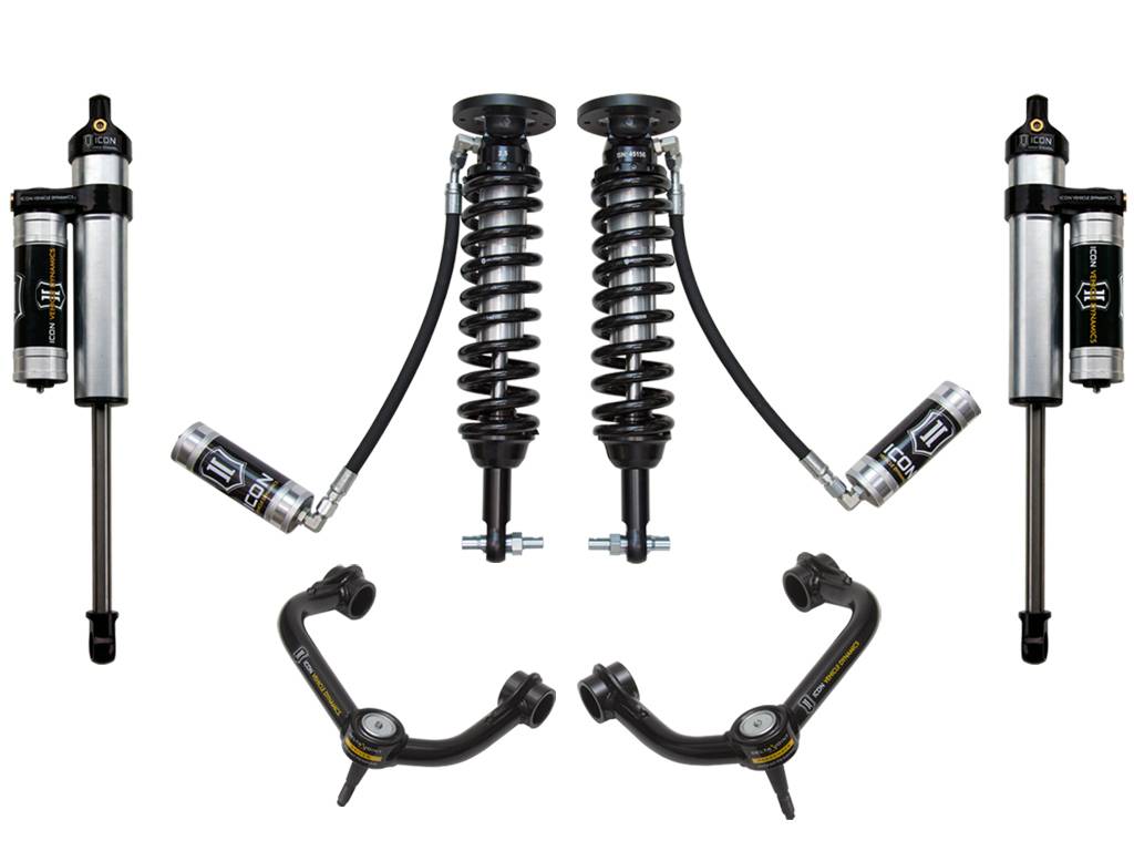 The ICON Vehicle Dynamics 2014 Ford F150 2WD Stage 4 suspension system is the best choice for drivers looking to maximize the on and off-road potential of their trucks and will inspire confidence behind the wheel in nearly any situation. ICON engineers’ primary focus is to increase wheel travel and damping ability, which translates into outstanding vehicle control and ride quality both on and off-road. This system includes vehicle-specific tuned 2.5” coilover shocks featuring an external remote reservoir for exceptional cooling properties and ICON-engineered Eibach coil springs for superior vehicle “feel” through the range of travel. These coilovers are also height adjustable from 1.75-2.63” of lift over stock allowing the use of larger, more aggressive wheel and tire combinations. Tubular upper control arms on the F150 not only add strength and durability, but help retain factory alignment spec range increasing caster over stock. ICON 2.5 Aluminum Series Piggyback rear shocks utilize a vehicle-specific valving that balances the performance of the truck from front to rear. 2.5" reservoir shocks front and rear ensure optimum performance by increasing the duration of consistent damping regardless of situation, keeping the shocks at a cooler operating temperature during extended off-road use. The ICON Vehicle Dynamics 2014 F150 2WD Stage 4 suspension system is an excellent choice for those drivers looking to enhance the capabilities of their pickup on the road as well as in the dirt.