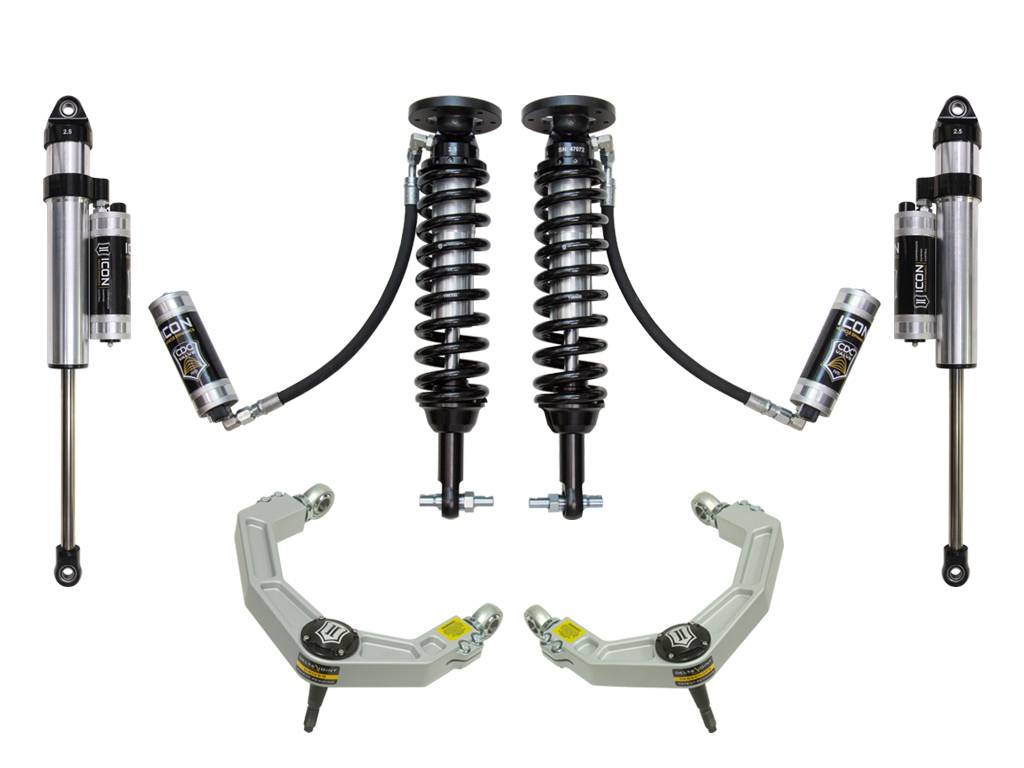 The ICON Vehicle Dynamics 2014 Ford F150 2WD Stage 5 suspension system is the best choice for drivers looking to maximize the on and off-road potential of their trucks and will inspire confidence behind the wheel in nearly any situation. ICON engineers’ primary focus is to increase wheel travel and damping ability, which translates into outstanding vehicle control and ride quality both on and off-road. This system includes vehicle-specific tuned 2.5” coilover shocks featuring an external remote reservoir w/ CDCV for exceptional cooling properties and ICON-engineered Eibach coil springs for superior vehicle “feel” through the range of travel. These coilovers are also height adjustable from 1.75-2.63” of lift over stock allowing the use of larger, more aggressive wheel and tire combinations. Billet aluminum upper control arms on the F150 not only add strength and durability, but help retain factory alignment spec range increasing caster over stock. ICON 2.5 Aluminum Series Piggyback rear shocks w/ CDCV utilize a vehicle-specific valving that balances the performance of the truck from front to rear. 2.5" CDC reservoir front and rear shocks ensure optimum performance by increasing the duration of consistent damping regardless of situation, keeping the shocks at a cooler operating temperature during heavy use. ICON's CDC Valve upgrade is included in this stage front and rear for those desiring an easy way to tune the ride externally with 10 settings from soft to hard.
