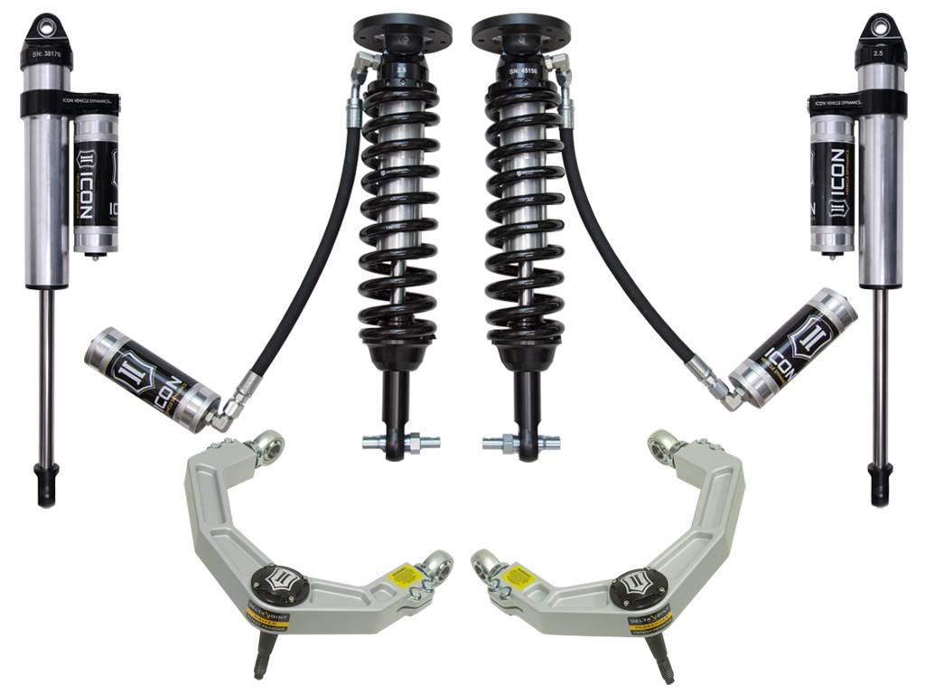 ICON Vehicle Dynamics 2015-2020 Ford F-150 4WD suspension systems are designed with maximum performance and the serious driver in mind. ICON engineers’ primary focus is to increase wheel travel and damping ability, which translates into outstanding vehicle control and ride quality both on and off-road. The Stage 4 system includes vehicle-specific tuned 2.5” coilover shocks featuring remote reservoirs for exceptional cooling properties and ICON-engineered Eibach coil springs for superior vehicle “feel” through the range of travel. These coilovers are also height adjustable from 2-2.63” allowing the use of larger, more aggressive wheel and tire combinations. Billet aluminum upper control arms on the F-150 not only add strength and durability, but help retain factory alignment spec range increasing caster over stock. ICON 2.5 Aluminum Series piggyback reservoir rear shocks utilize a vehicle-specific valving that balances the performance of the truck from front to rear. The ICON Vehicle Dynamics 2015-2020 F-150 4WD Stage 4 suspension system is an excellent choice for those drivers looking to enhance the capabilities of their pickup on the road as well as in the dirt.