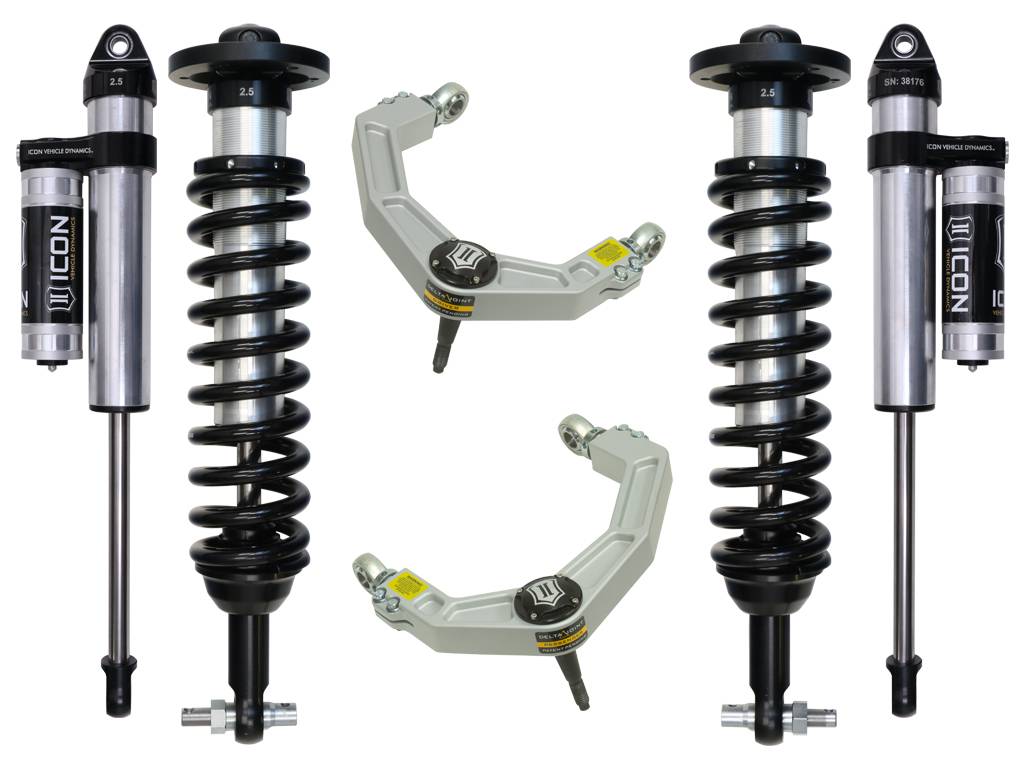 This system features upper control arms with ICON's patented Delta Joint. The Delta Joint is a heavy duty high angle ball joint that combines the durability of a ball joint with the performance characteristics of a traditional uniball. While the industry standard uniball does a great job of allowing the control arms of a vehicle to articulate with little bind, they do have an inherent weakness that leaves more to be desired when used in a daily driven application - exposure to the elements. The Delta Joint features a zinc plated housing providing the first layer of corrosion resistance, while a tough grease seal keeps potentially harmful elements out of the inner workings of the joint. Metal on metal construction and a greasable design increase the longevity of the Delta Joint while at the same time allowing for noise-free operation. What makes the Delta Joint unique is that it brings the best of both worlds to ICON upper control arms with features that make it more robust than a uniball, and at the same time capable of greater angularity than a typical ball joint.